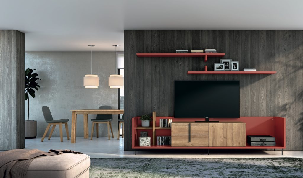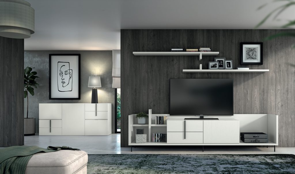 La composición Class 819 es un mueble de salón multifuncional diseñado para albergar equipamiento audiovisual y objetos decorativos. La estructura está compuesta por módulos horizontales y verticales, fabricados en melamina con acabado blanco mate, lo que aporta un aspecto moderno y minimalista. Incluye compartimentos abiertos y cerrados, ideales para almacenar libros, dispositivos electrónicos y otros accesorios. Incorpora dos estantes superiores suspendidos que permiten la exposición de fotografías y pequeños objetos personales, optimizando el espacio vertical. El diseño se apoya en patas metálicas discretas para mayor estabilidad y un toque contemporáneo, mientras que el fondo de panel melamínico en tono oscuro aporta contraste visual y sofisticación.
