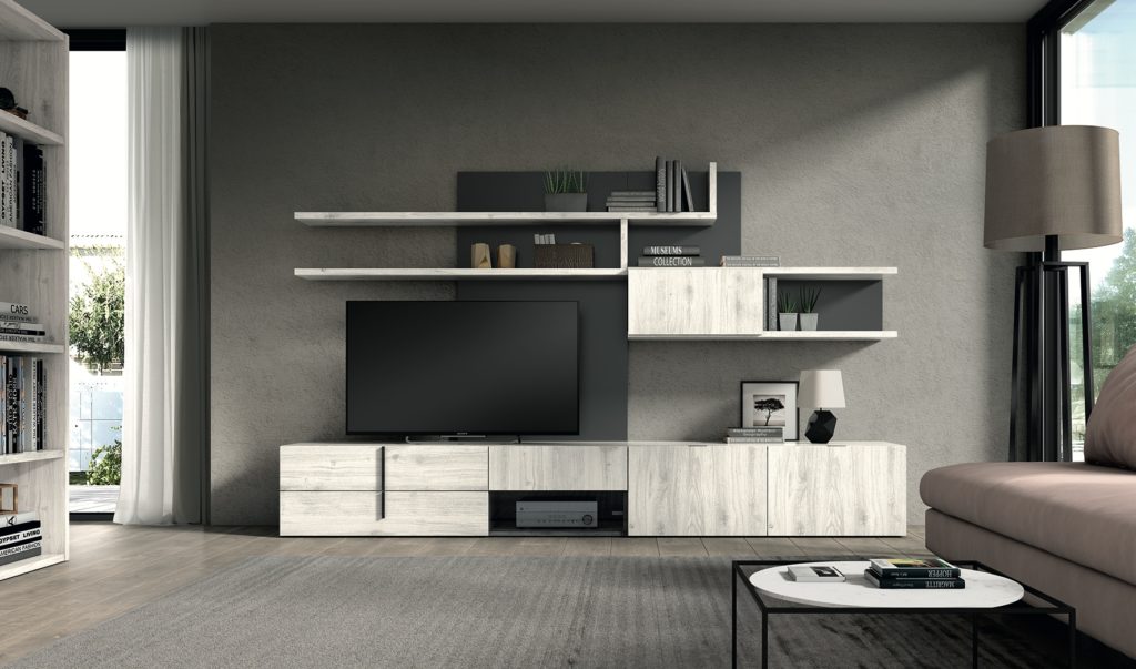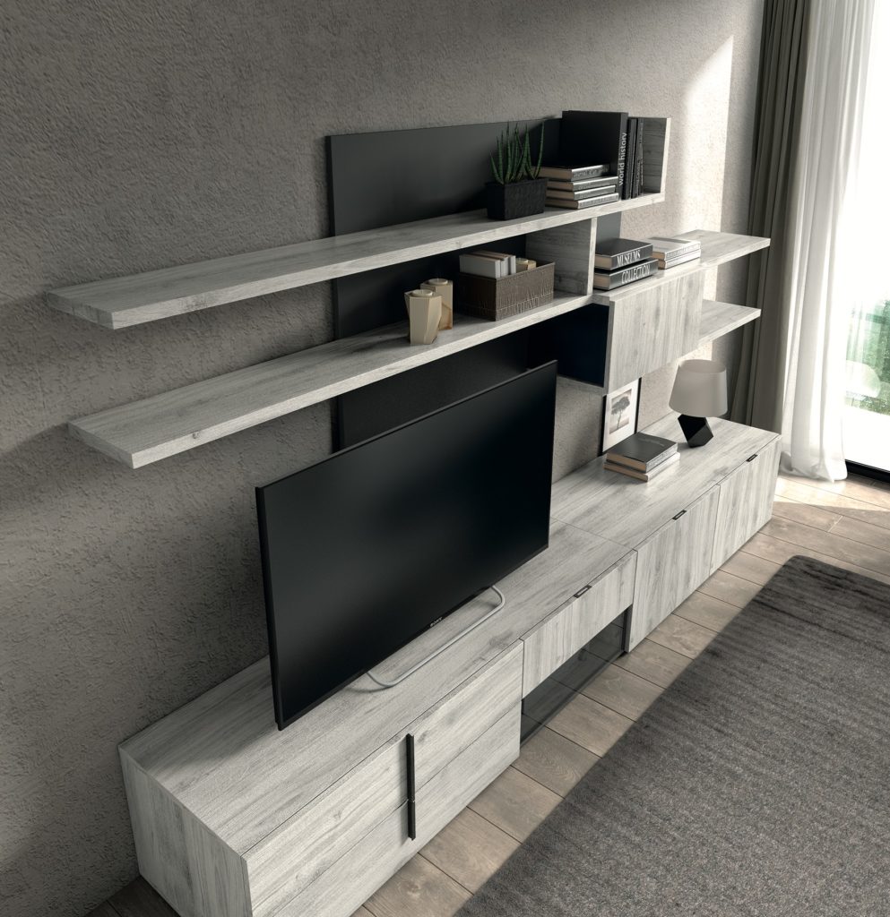 El conjunto modular para salón Class 829 combina almacenaje cerrado y estanterías abiertas, fabricado en tablero laminado de alta resistencia con acabado en madera clara texturizada. Destaca por su diseño contemporáneo y líneas rectas, integrando elementos asimétricos que aportan dinamismo visual. El módulo inferior sirve de soporte para televisor y equipos electrónicos, incorporando puertas abatibles y huecos ventilados, lo que facilita la organización de dispositivos. Las estanterías superiores permiten la disposición decorativa de libros y objetos, mientras que las zonas cerradas protegen de polvo el contenido. El panel trasero en color gris oscuro añade contraste y acentúa la profundidad del conjunto.