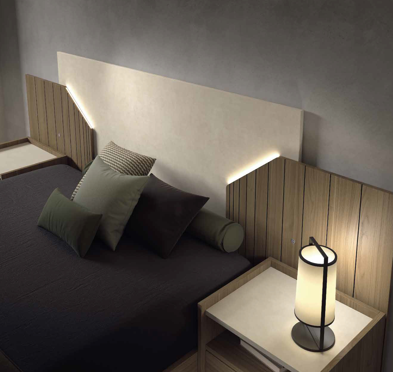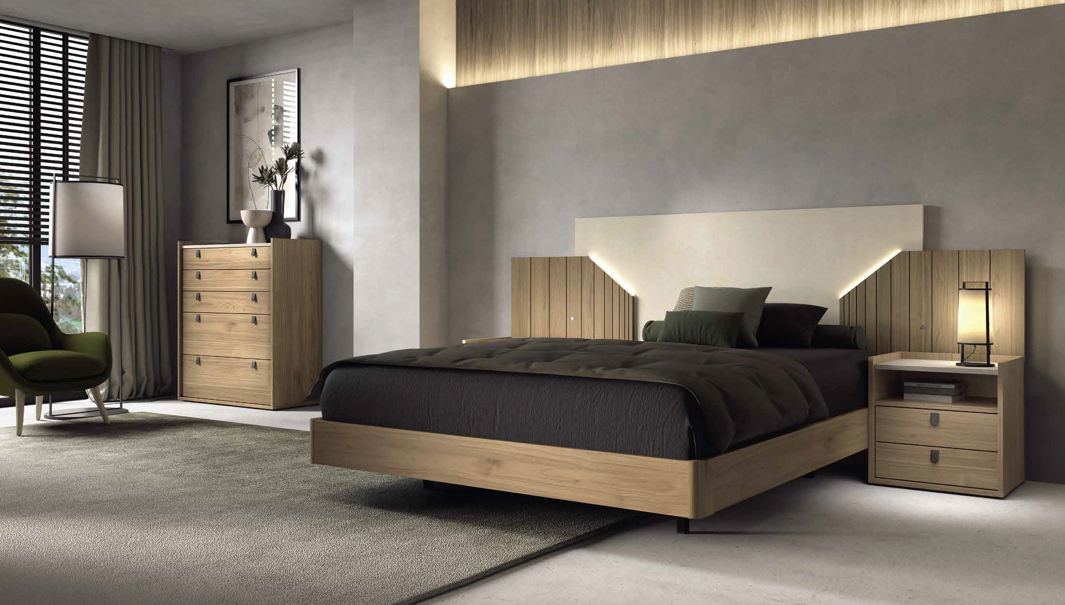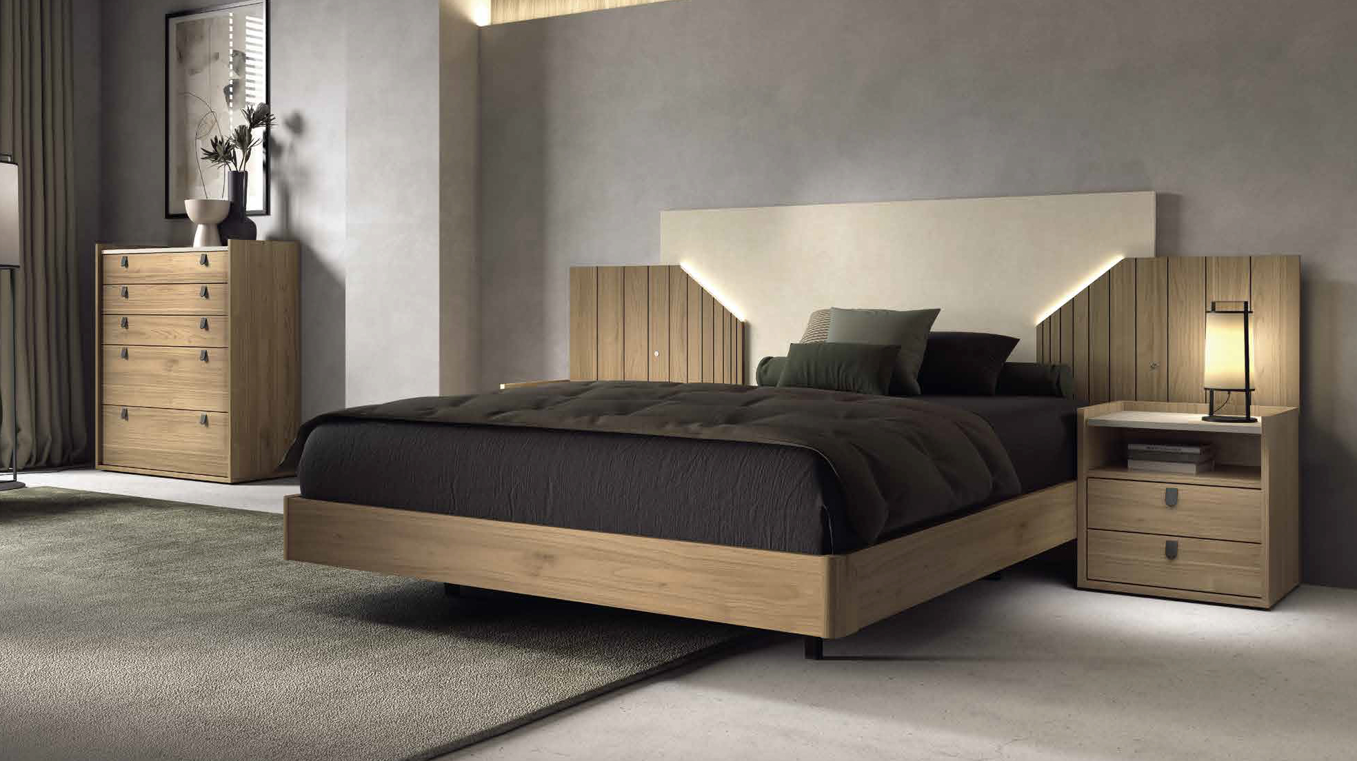 • El cabecero presenta una combinación de paneles verticales en madera con un acabado natural y una pieza central tapizada en tono claro, creando contraste visual. • El diseño incluye líneas diagonales en la parte superior de los paneles, que se unen en el centro, aportando dinamismo y simetría al conjunto. • En los extremos del cabecero se integran tiras LED ocultas, proporcionando iluminación ambiental indirecta, ideal para crear atmósfera relajante. • Los paneles de madera del cabecero están fijados a la pared y alineados detrás de las mesillas, extendiendo el diseño y unificando la composición. • Las mesillas de noche son de madera a juego, con una estructura robusta y líneas limpias que refuerzan el estilo contemporáneo. • Cada mesilla dispone de dos cajones inferiores con tiradores metálicos rectangulares, que facilitan el acceso y añaden un toque de contraste. • La parte superior de las mesillas contiene una superficie libre y un espacio abierto debajo, ideal para colocar libros u objetos decorativos y de uso diario. • En la parte superior de cada mesilla se ha colocado una luminaria vertical, alineada con la estética moderna del dormitorio y complementando la luz ambiental del cabecero.