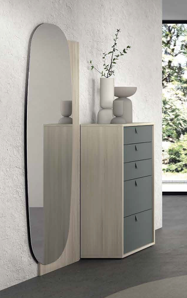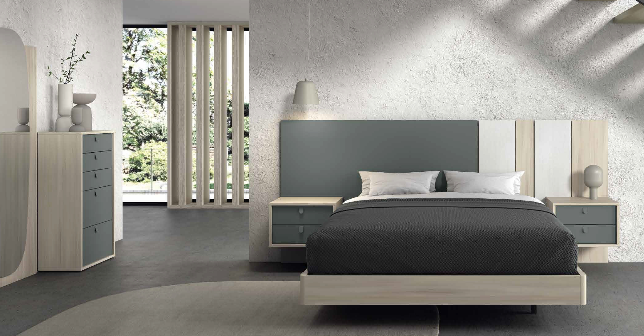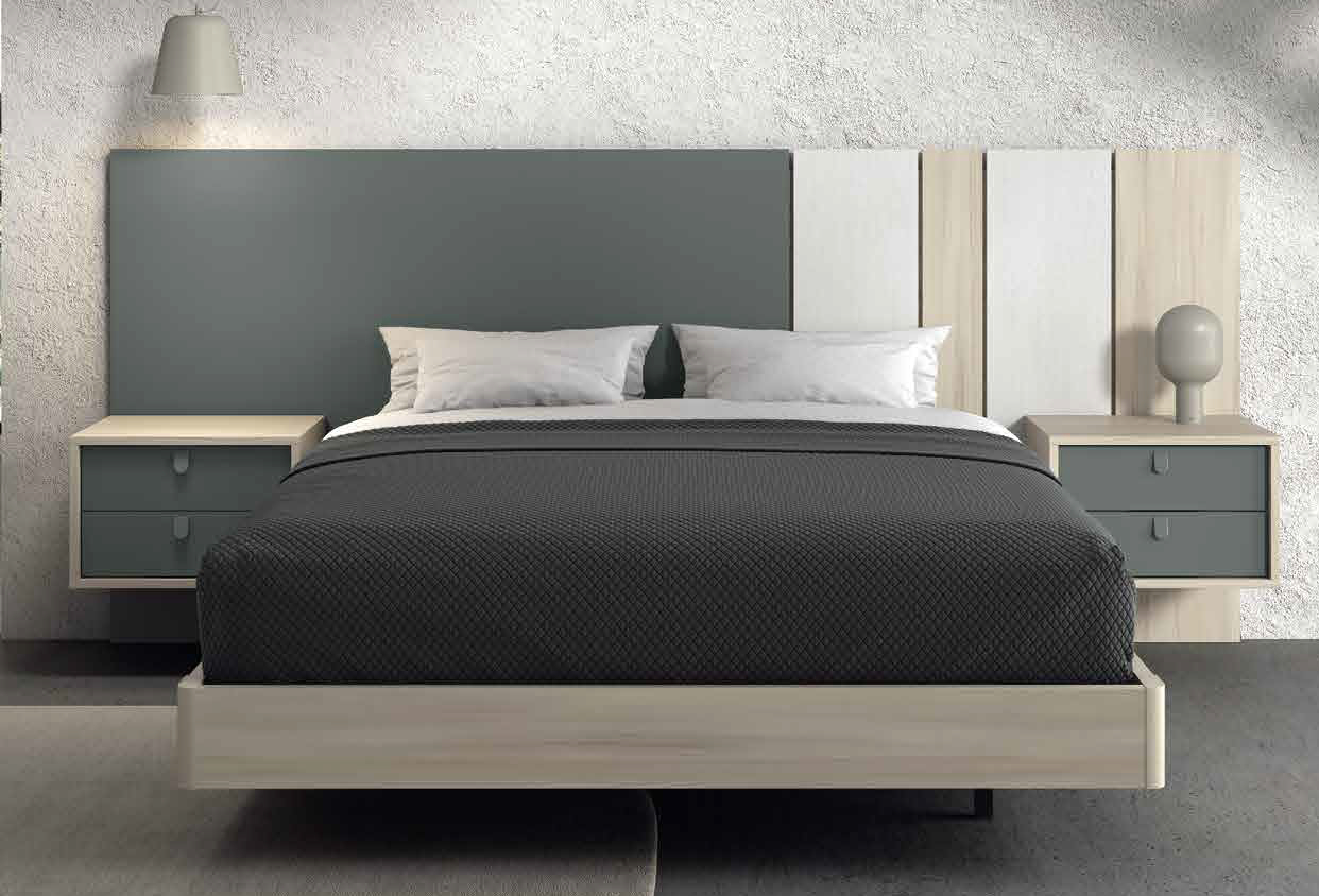 La composición del cabecero y las mesillas destaca por su estilo moderno y líneas rectas, combinando tonos grises y madera clara. El cabecero es amplio, formado por paneles verticales en diferentes colores, alternando el gris y el blanco, lo que aporta dinamismo visual. Las mesillas, suspendidas y de diseño minimalista, cuentan con dos cajones en gris oscuro y estructura en madera clara, logrando un bonito contraste y uniformidad con el cabecero. Los tiradores discretos y superficies limpias refuerzan el aspecto contemporáneo y funcional, proporcionando un ambiente elegante y acogedor para el dormitorio.
