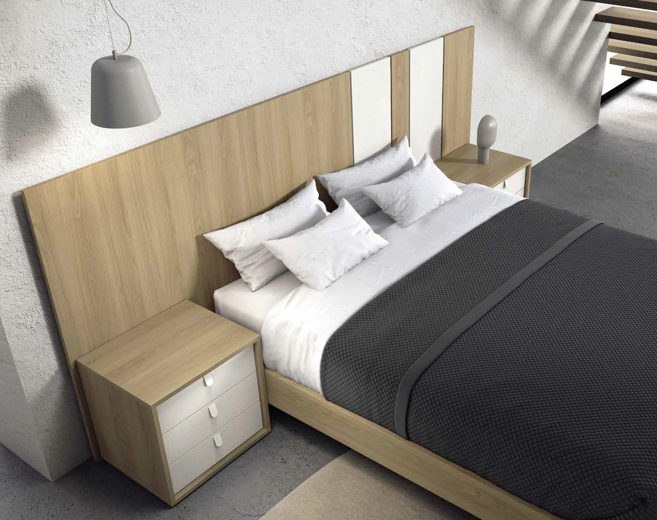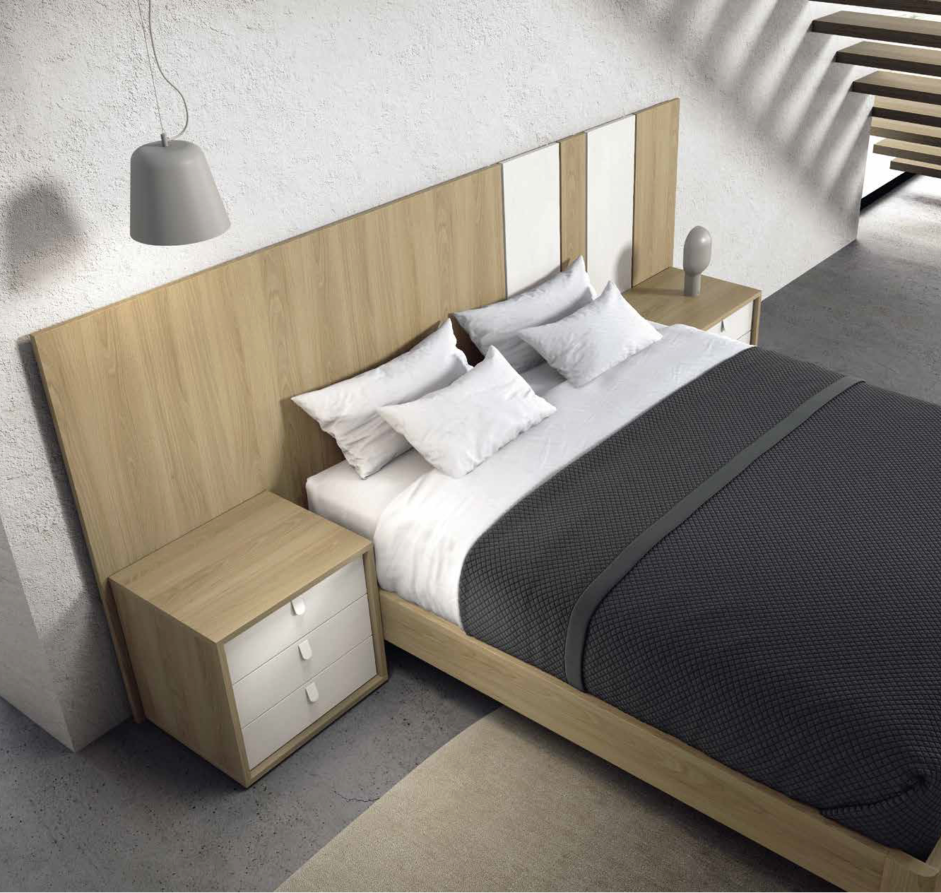 Este tipo de composición aporta una estética moderna y cálida, creando un ambiente acogedor gracias al cabecero de madera y la integración visual con las mesillas a juego. El cabecero, además, protege la pared de manchas y golpes, y facilita el apoyo al sentarse en la cama. Las mesillas permiten tener siempre a mano objetos útiles y ayudan a mantener el orden.