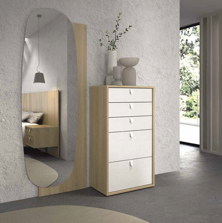 El cabecero de este dormitorio destaca por su diseño moderno, compuesto por paneles de madera clara con franjas verticales blancas que aportan luminosidad y contraste al conjunto. Las mesillas, a juego con el cabecero, presentan una estructura de madera clara y tres cajones frontales en blanco, ofreciendo espacio de almacenamiento funcional y armonía visual. Las líneas rectas y el acabado natural confieren a la composición una sensación de amplitud y serenidad, ideal para crear un ambiente acogedor en el dormitorio. Además, los detalles en blanco refuerzan la estética contemporánea y equilibrada del conjunto.