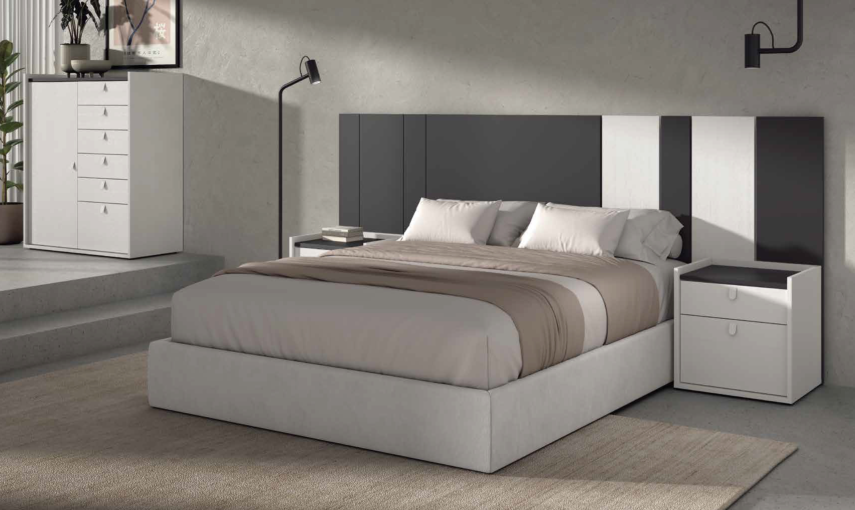 Dormitorio moderno con cabecero grande en blanco y gris, cama amplia y mesillas de noche a juego. Diseño minimalista y funcional, ideal para un ambiente elegante y confortable en el hogar, con líneas rectas y tonos neutros.