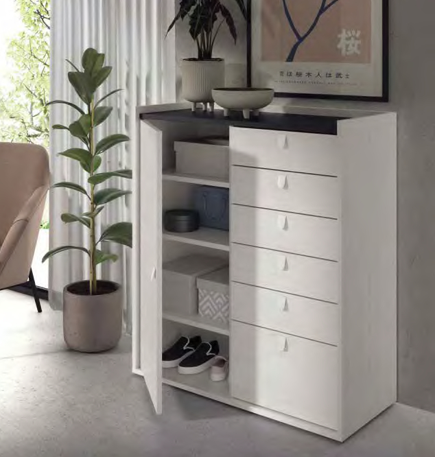 Esta composición de cabecero y mesillas para el dormitorio presenta un estilo moderno y elegante, basado en líneas rectas y una cuidada combinación de colores neutros. El cabecero destaca por sus paneles verticales alternos en tonos gris oscuro y blanco, creando un efecto visual contemporáneo y armonioso. Las mesillas a juego siguen la misma estética, con una estructura en blanco y una superficie superior en gris oscuro, lo que refuerza la coherencia del conjunto. Cada mesilla dispone de dos amplios cajones con tiradores discretos, ofreciendo funcionalidad y una imagen minimalista ideal para dormitorios actuales.