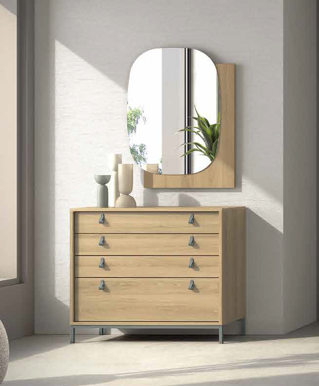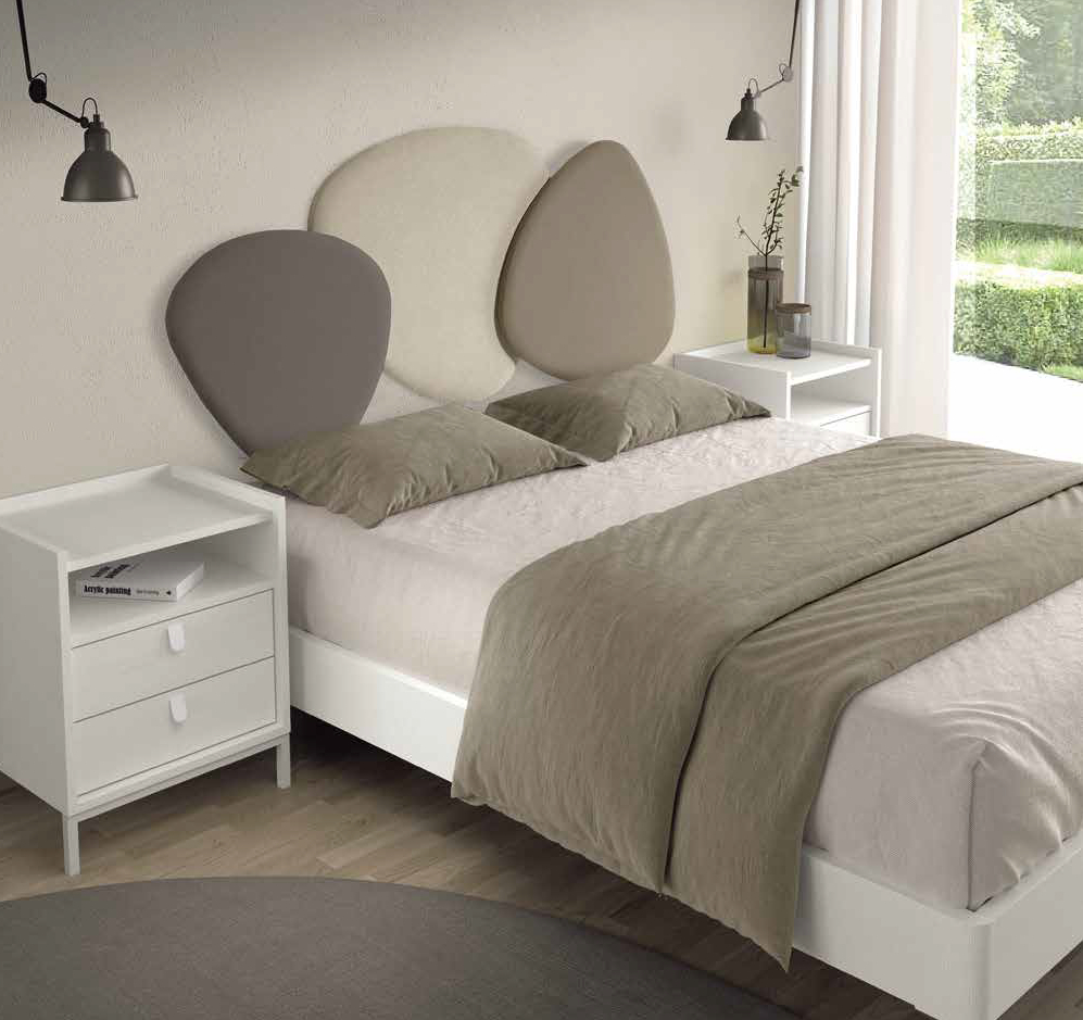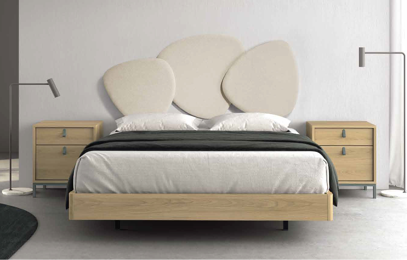El cabecero del dormitorio está formado por tres piezas tapizadas con formas irregulares y orgánicas en color beige claro, que aportan un aire moderno y acogedor al espacio. Cada pieza tiene un diseño asimétrico que recuerda a piedras suavemente redondeadas, creando una composición visual dinámica. Las mesillas, a ambos lados de la cama, son de madera clara con patas metálicas, combinando líneas rectas y detalles sencillos. Disponen de dos cajones con tiradores discretos en tono gris, lo que otorga funcionalidad sin perder la estética minimalista y natural, perfecta para ambientes tranquilos y contemporáneos.