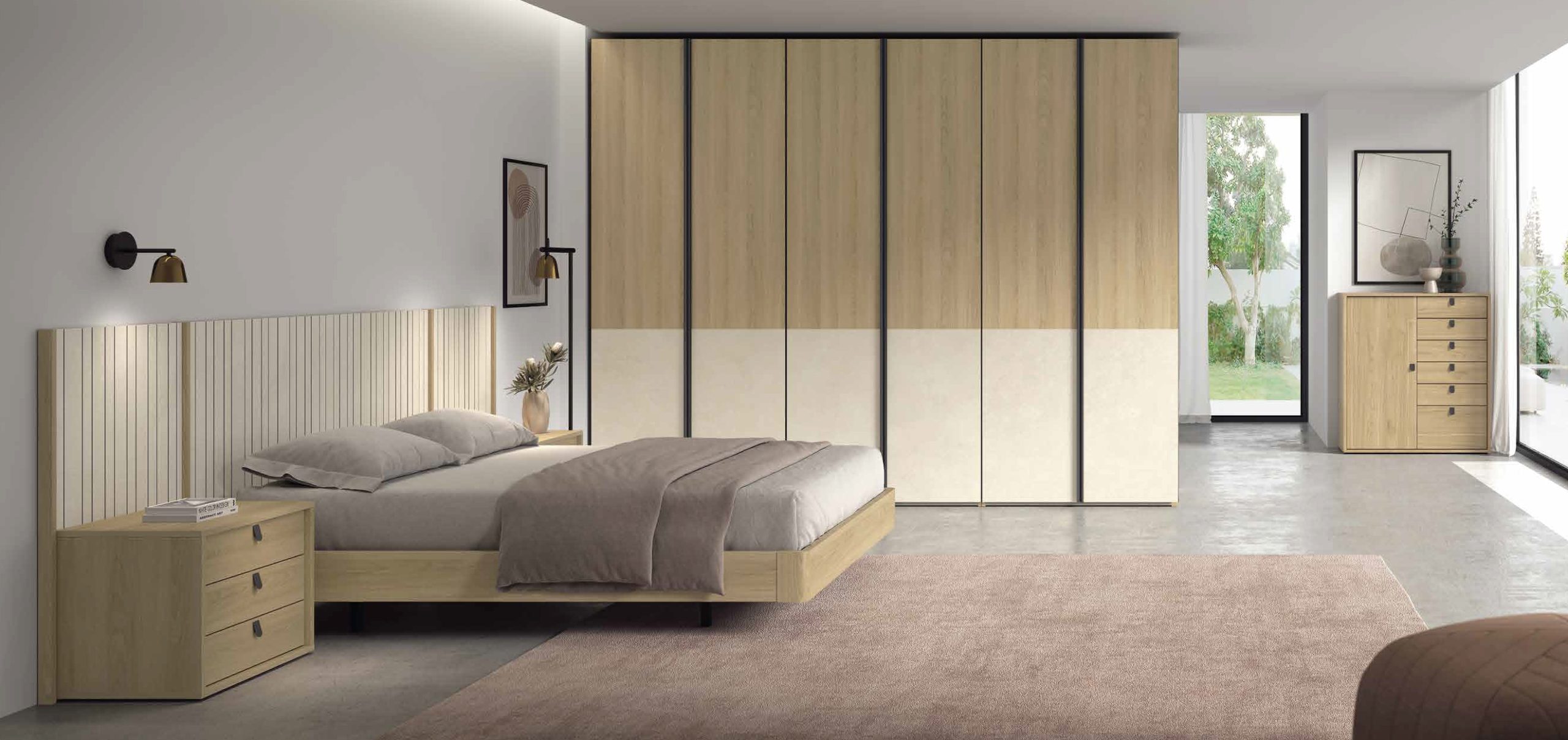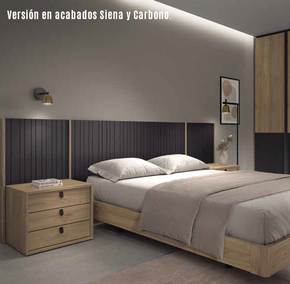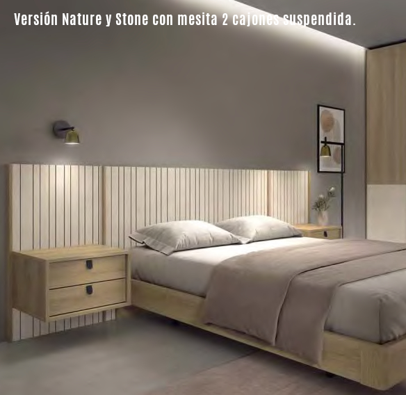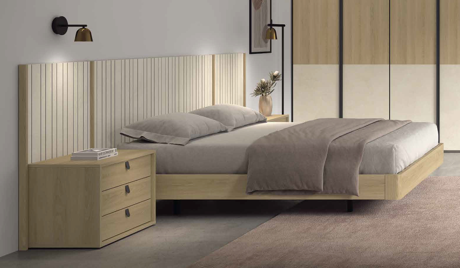 El cabecero del dormitorio está compuesto por paneles verticales de madera clara que aportan sensación de amplitud y modernidad al espacio. Cada panel tiene líneas finas y alargadas que generan continuidad visual, creando una atmósfera elegante y acogedora. Las mesillas, suspendidas y también realizadas en madera clara, se integran perfectamente con el diseño del cabecero gracias a sus acabados y formas rectas. Cuentan con dos cajones y tiradores oscuros, proporcionando almacenamiento funcional y manteniendo el estilo minimalista. Esta composición resulta ideal para dormitorios actuales, ofreciendo calidez y practicidad en un diseño coherente y armonioso.Composicion-Dormitorio.jpg