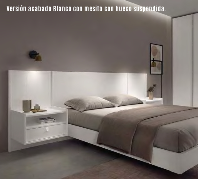 Diseño contemporáneo con líneas verticales que aportan elegancia visual. Mesillas suspendidas que facilitan la limpieza del suelo y mejoran la estética. Espacio integrado que aprovecha la pared, optimizando el área útil.