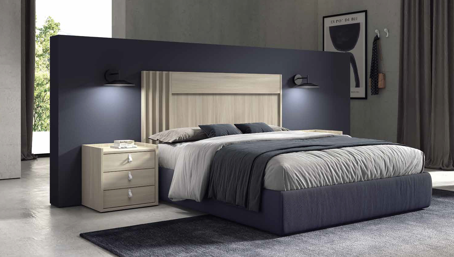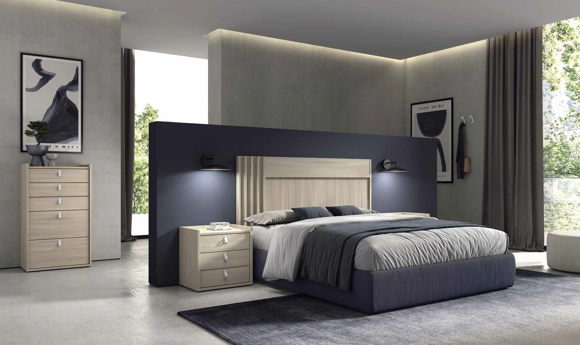 Este dormitorio destaca por su diseño moderno y funcional, que combina líneas rectas y acabados en madera natural, aportando calidez y elegancia al espacio. La presencia de una mesilla de noche con varios cajones facilita el almacenamiento y ayuda a mantener el orden en la habitación. Además, la estructura robusta y la combinación de texturas ofrecen un ambiente acogedor y contemporáneo.
