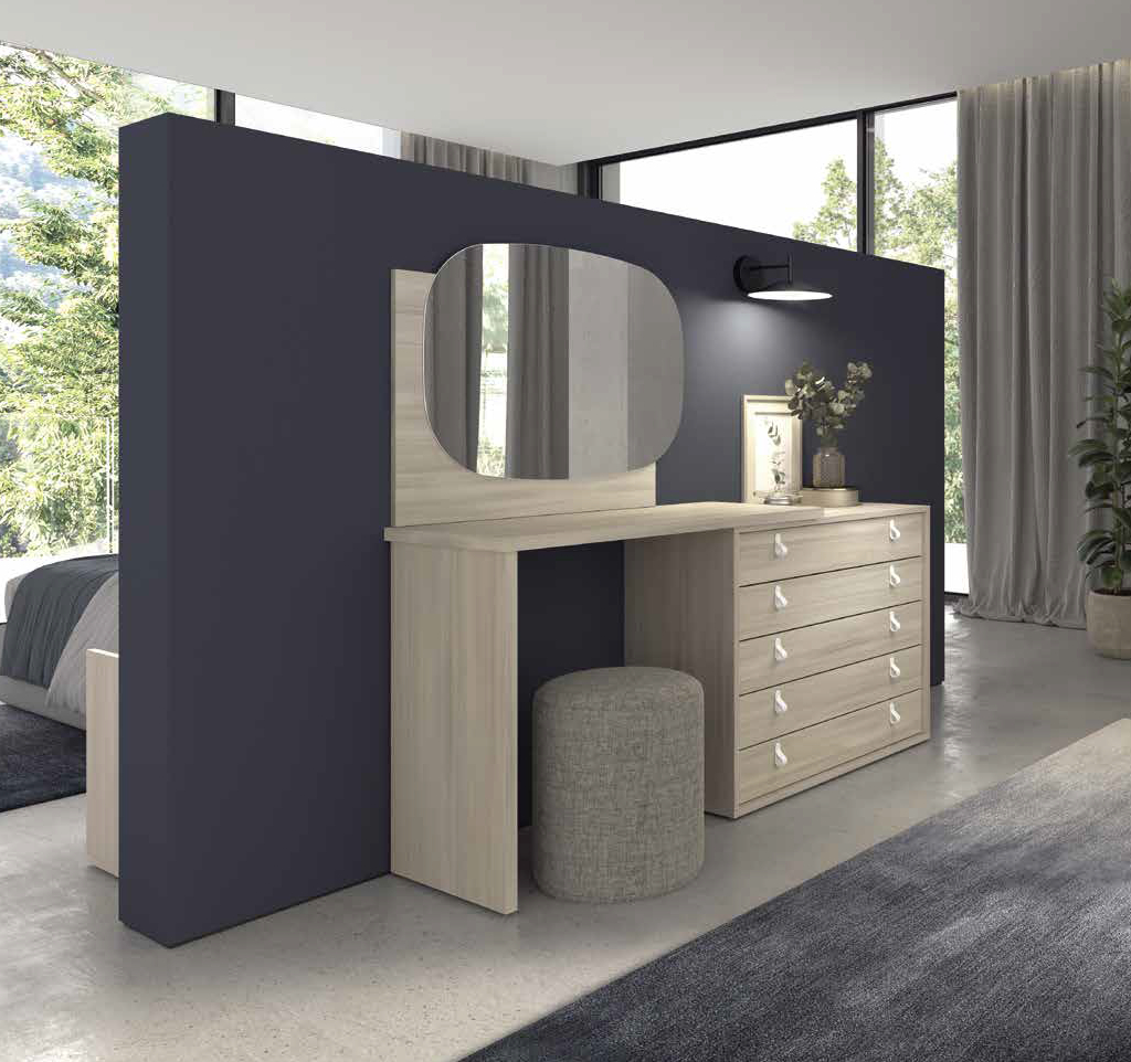 Para conservar este dormitorio, se recomienda limpiar las superficies de madera con un paño seco o ligeramente humedecido, evitando productos agresivos que puedan dañar el acabado. Los tiradores metálicos pueden mantenerse pasando un paño suave y seco. Es aconsejable evitar el exceso de humedad y utilizar productos específicos para madera si fuese necesario, garantizando así la conservación del color y la integridad de los materiales.