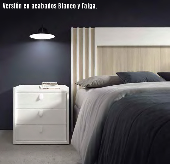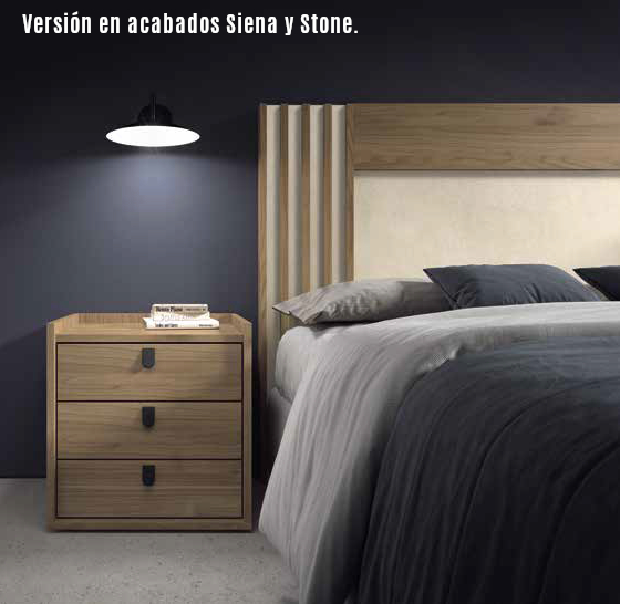 Dormitorio moderno compuesto por cabecero de madera con detalles decorativos verticales, y mesita de noche con tres cajones y tiradores negros estilo minimalista. Ideal para ambientes acogedores y funcionales.