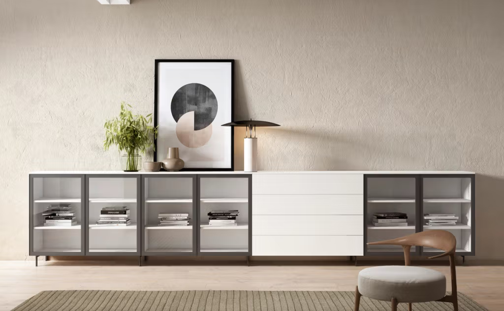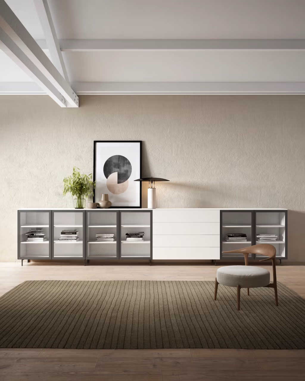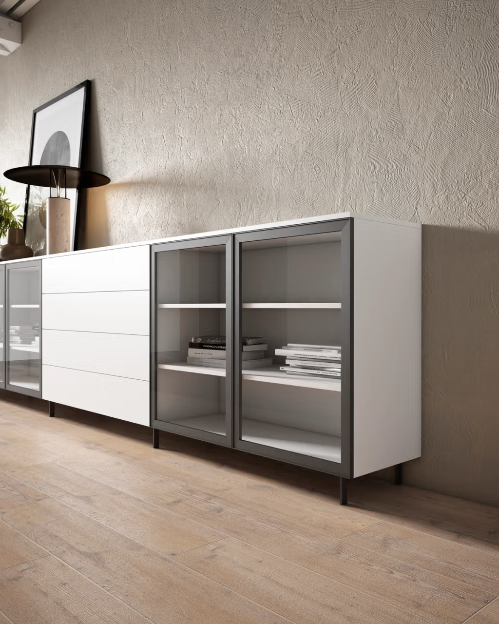 Este aparador se destaca por su ancho variable, que puede ajustarse entre 80 cm y 600 cm, lo que permite adaptarlo perfectamente a diferentes espacios y requerimientos. La versatilidad de este aparador también se refleja en su diseño exterior donde la tapa vuela por encima de los frontales. Una nueva estructura para un mueble excepcional. Se puede elegir entre diferentes opciones, como puertas, cajones y puertas de aluminio, para crear la disposición ideal según el uso y las preferencias