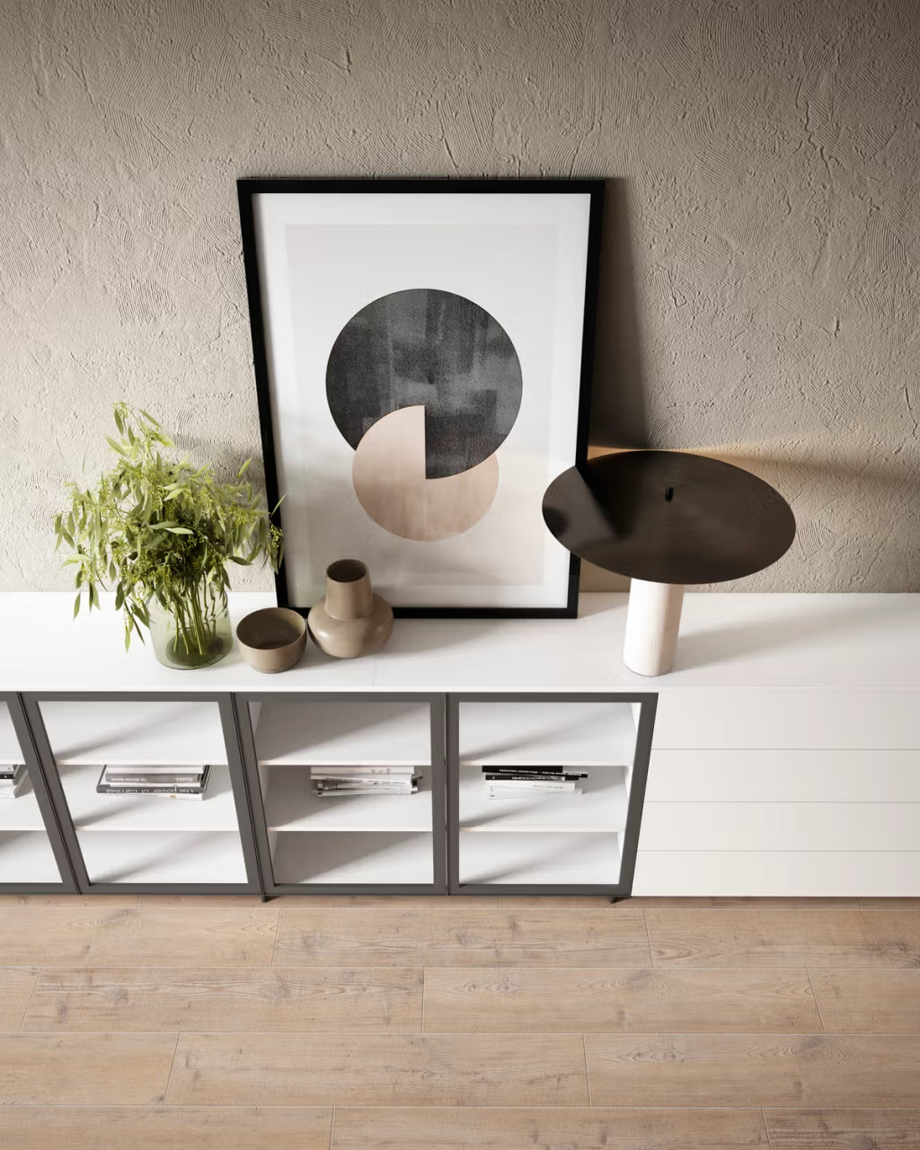 • Estructura realizada en tablero de MDF lacado, lo que proporciona estabilidad y acabado uniforme. • Puertas con marco en tono oscuro y cristal transparente, dejando a la vista el interior del mueble. • Estantes interiores regulables, permitiendo adaptar la distribución según las necesidades. • Zona central con cajoneras de apertura horizontal, ideales para almacenaje cerrado y organizado. • Tiradores integrados, favoreciendo el diseño minimalista y limpio sin elementos sobresalientes. • Patas metálicas con diseño estilizado, que elevan el mueble y facilitan la limpieza debajo. • Acabado combinado en blanco para los cajones y gris oscuro para el marco, creando contraste y personalidad. • Fondo y laterales con acabado liso, pensados para apoyar el mueble directamente sobre la pared.