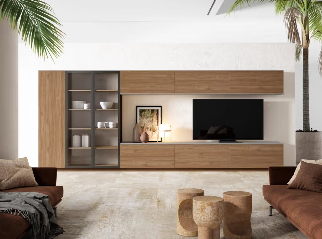 Mueble de salón modular en tonos madera y detalles en cristal, con espacio para televisor, almacenaje y estantería decorativa, ideal para salones modernos que buscan funcionalidad y estilo en un solo diseño.