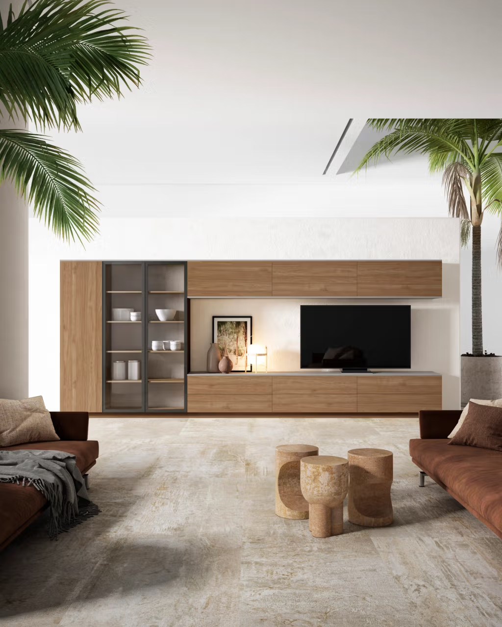 Una composición de salón moderna y minimalista, compuesta por colgantes, muebles de televisión y vitrinas. Ofrece un diseño equilibrado y funcional.
