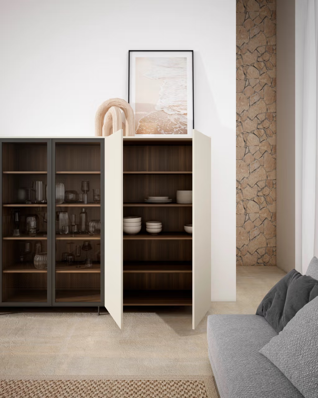 Las vitrinas complementan el aspecto moderno y minimalista de la composición. Están diseñadas para exhibir y proteger objetos decorativos, vajillas u otros elementos de valor.