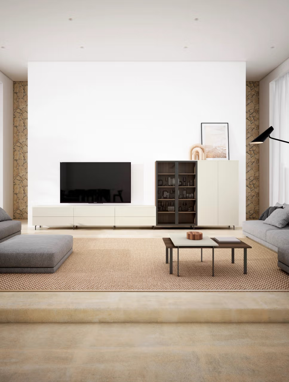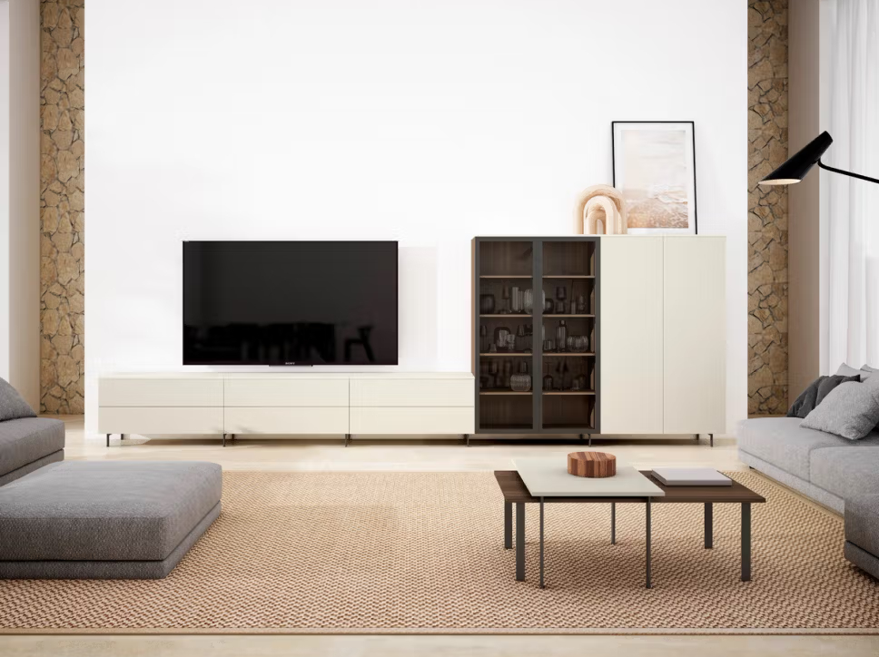 La composición de salón de aspecto moderno y minimalista está compuesta por muebles de televisión y vitrinas, creando un conjunto elegante y funcional para el salón.
