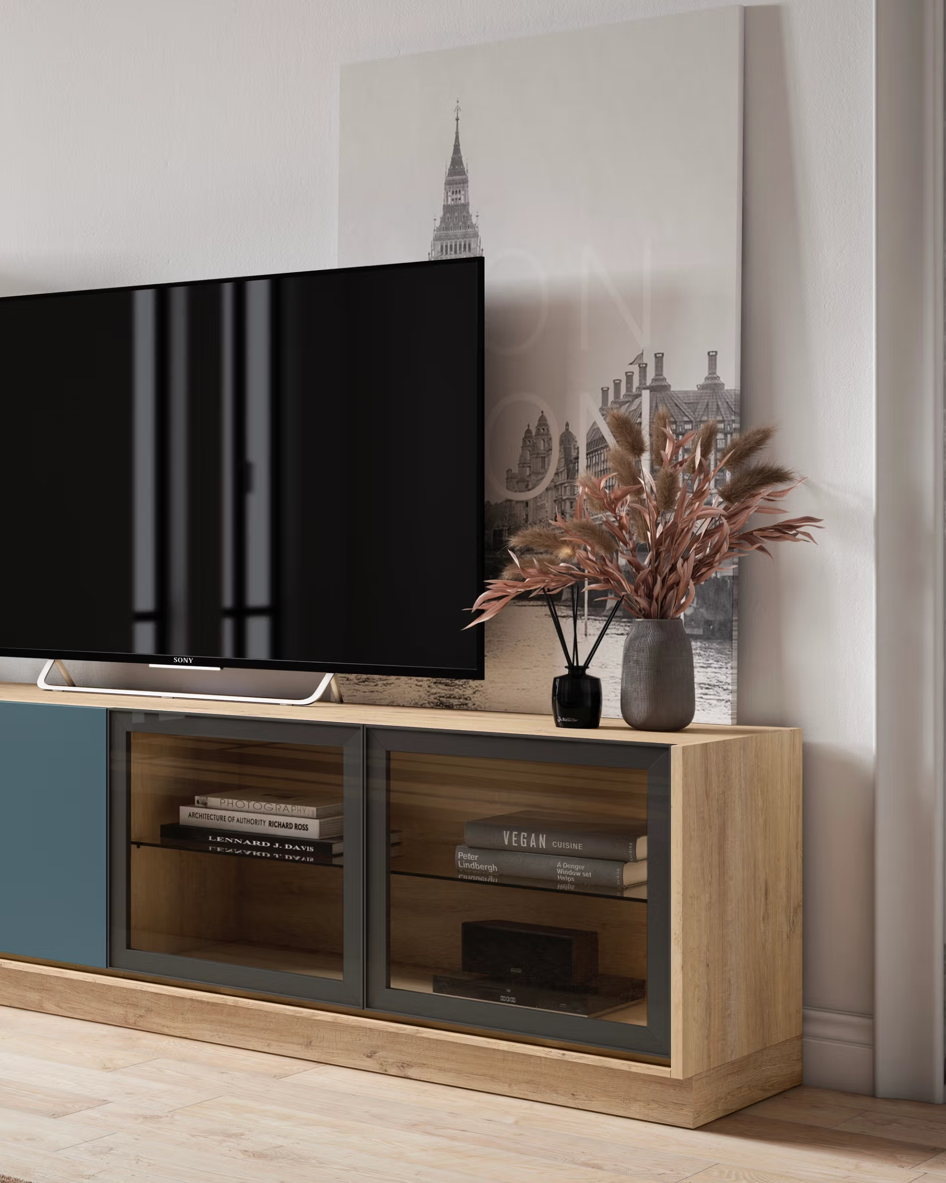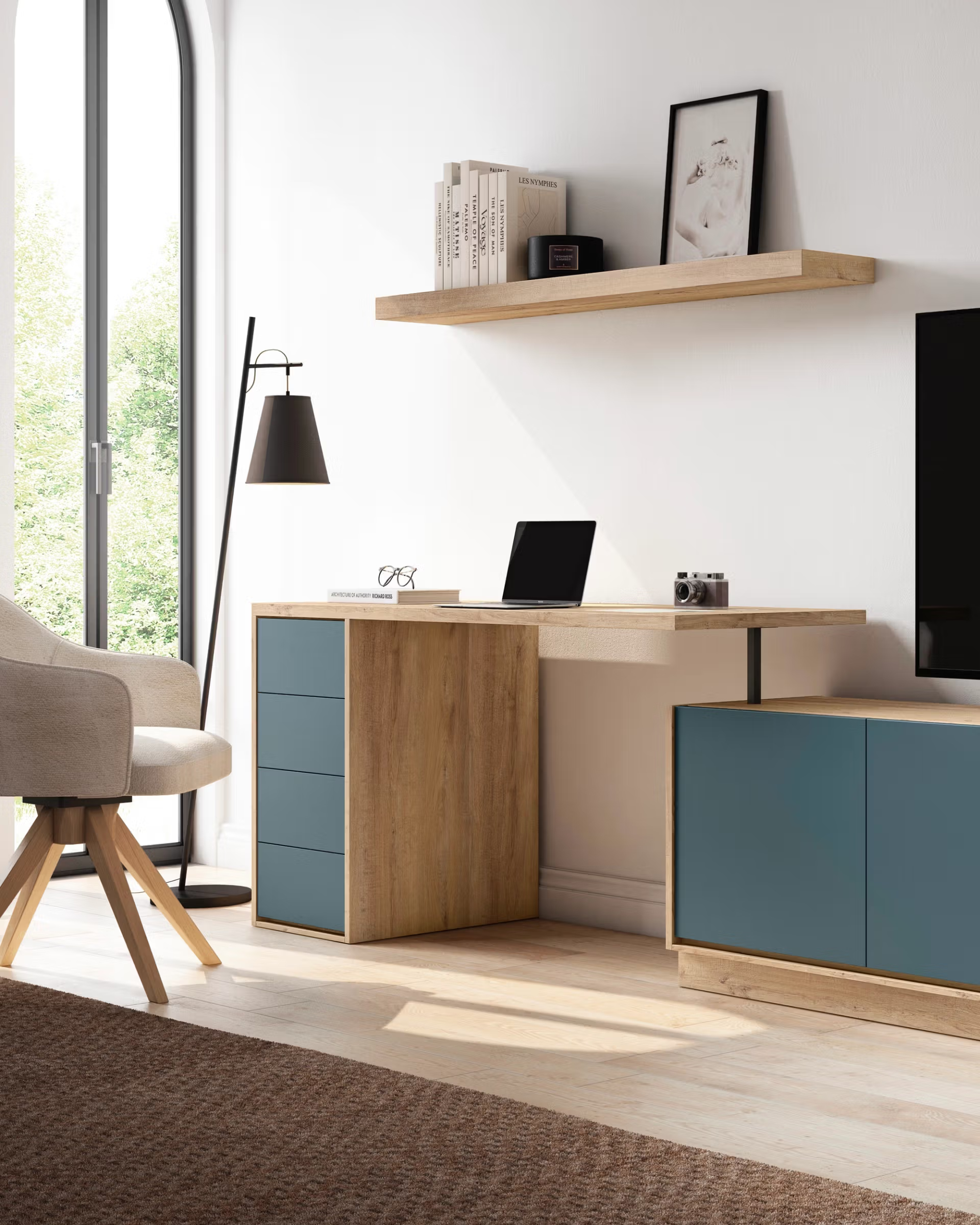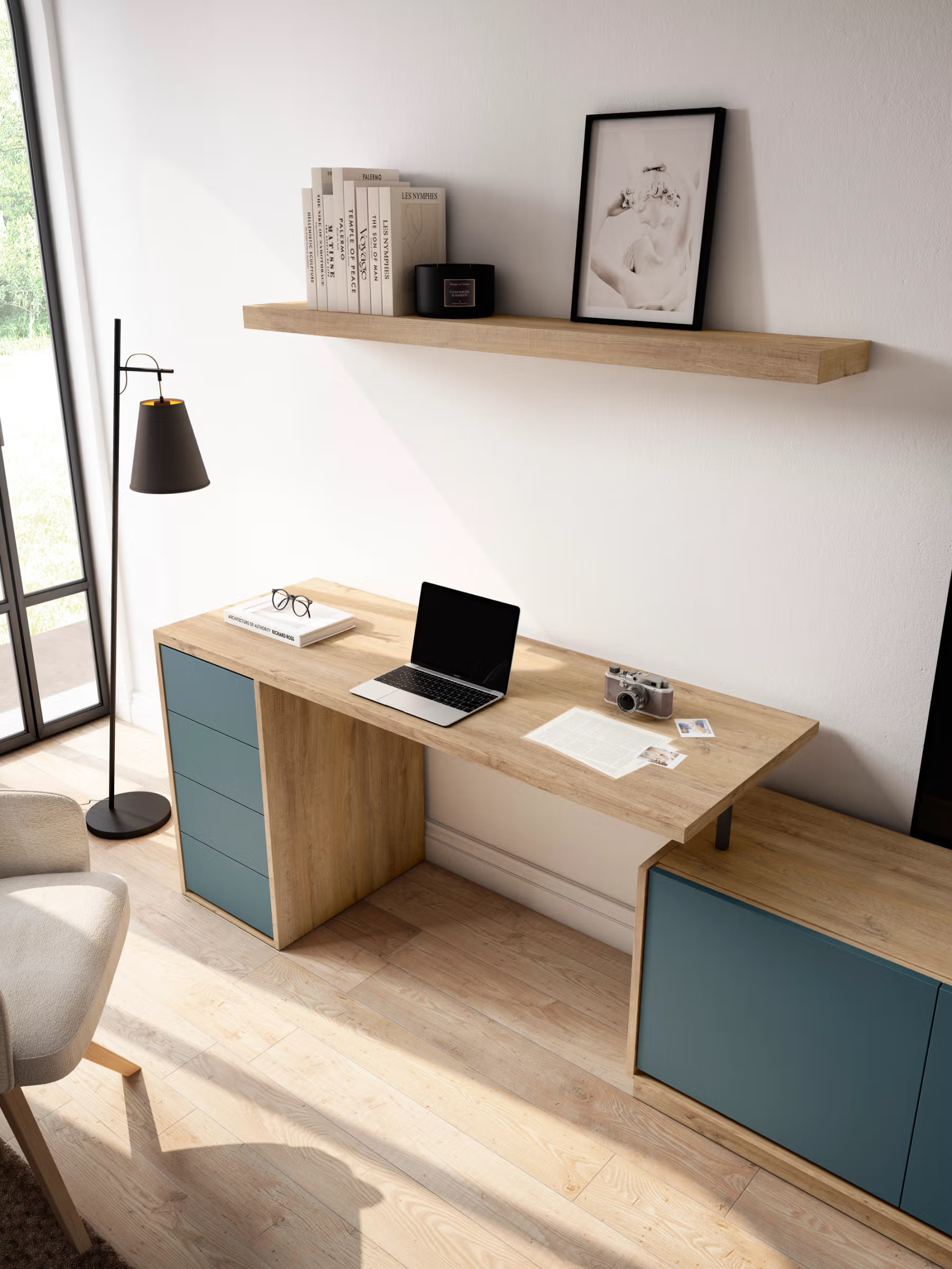 • Estructura realizada en tablero aglomerado de alta densidad con recubrimiento melamínico tipo roble natural. • Frentes de cajones y puertas con acabado liso en color azul mate, laminado para facilitar la limpieza y protección frente a arañazos. • Módulo bajo tipo aparador/cómoda con tacos de base retranqueados para mayor estabilidad y diseño flotante. • Puertas correderas de cristal templado enmarcado, ideal para mostrar libros y objetos decorativos, incorporando perfil metálico oscuro para contraste. • Encimera reforzada en cada módulo de almacenamiento, permitiendo el soporte de elementos electrónicos y decorativos de peso medio. • Módulo lateral con escritorio extraíble y estructura metálica negra en soporte, optimizando el espacio para teletrabajo o estudio. • Sistema de apertura sin tiradores visibles (“push” o uñero lateral) para una imagen limpia y contemporánea. • Estante superior anclado a la pared mediante herrajes ocultos reforzados, pensado para libros y pequeños objetos de diseño.
