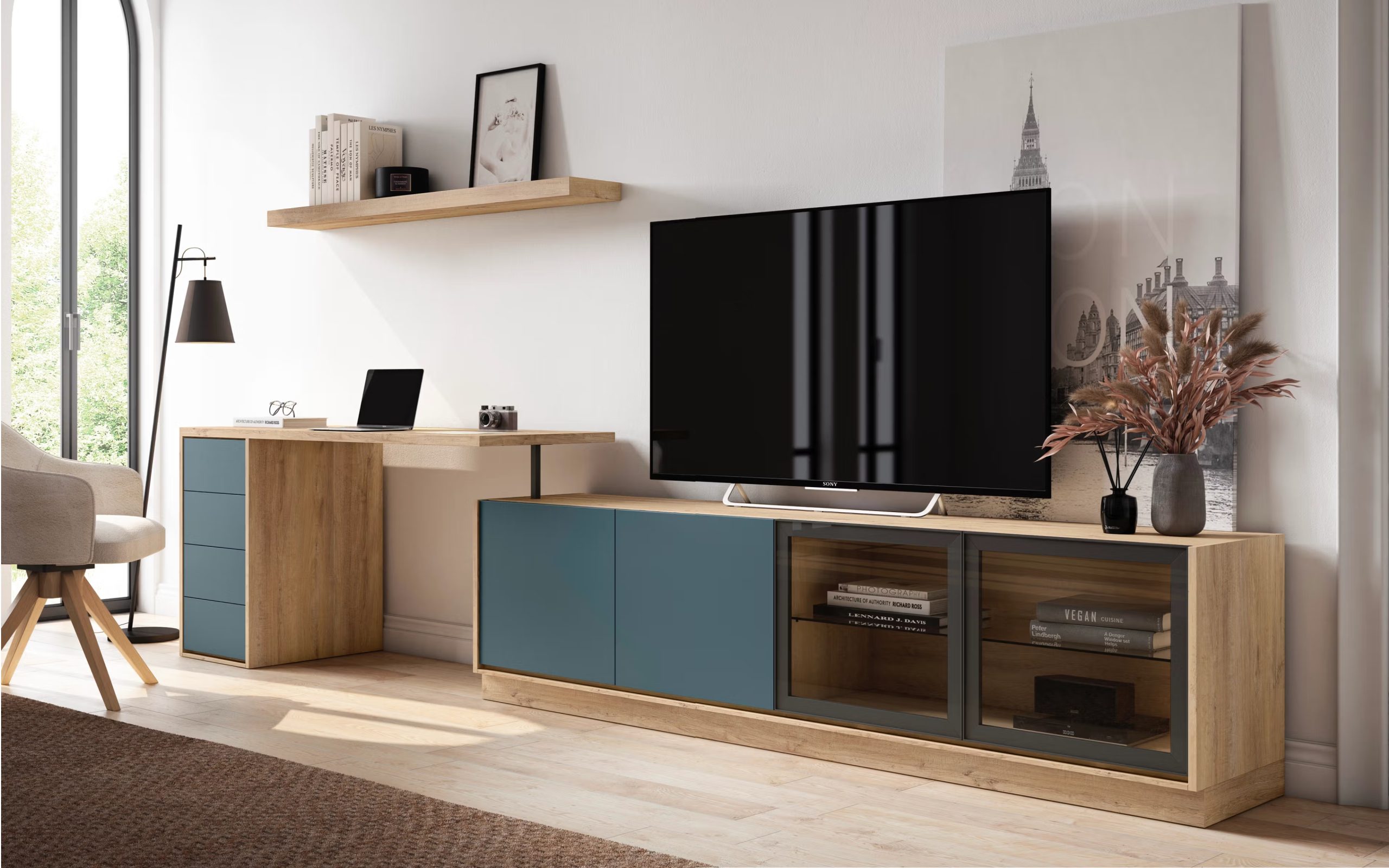 Composición moderna para salón en tonos roble y azul, integrada por mueble bajo con vitrina, escritorio lateral con cajones y balda superior, ideal para espacios funcionales y actuales. Diseño elegante y práctico.