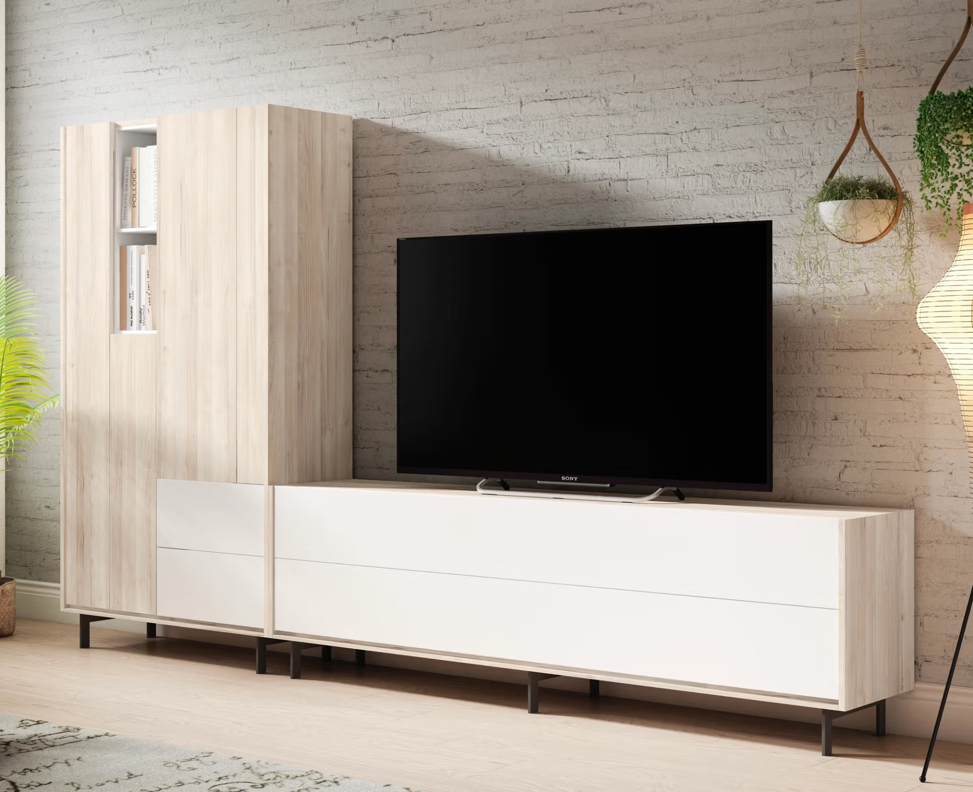 Esta composición de salón presenta un diseño moderno y funcional, combinando tonos claros de madera con frentes blancos lisos. El mueble incluye una estructura principal con dos grandes módulos horizontales de cajones ideales para almacenamiento, y un módulo vertical que aporta capacidad extra con puertas y estantes abiertos. Su base elevada con patas metálicas negras favorece la limpieza y añade un toque ligero al conjunto. Destacan las líneas rectas y el aspecto minimalista, perfecto para ambientes contemporáneos. Además, el espacio central está pensado para acomodar un televisor, proporcionando orden y elegancia en el salón.