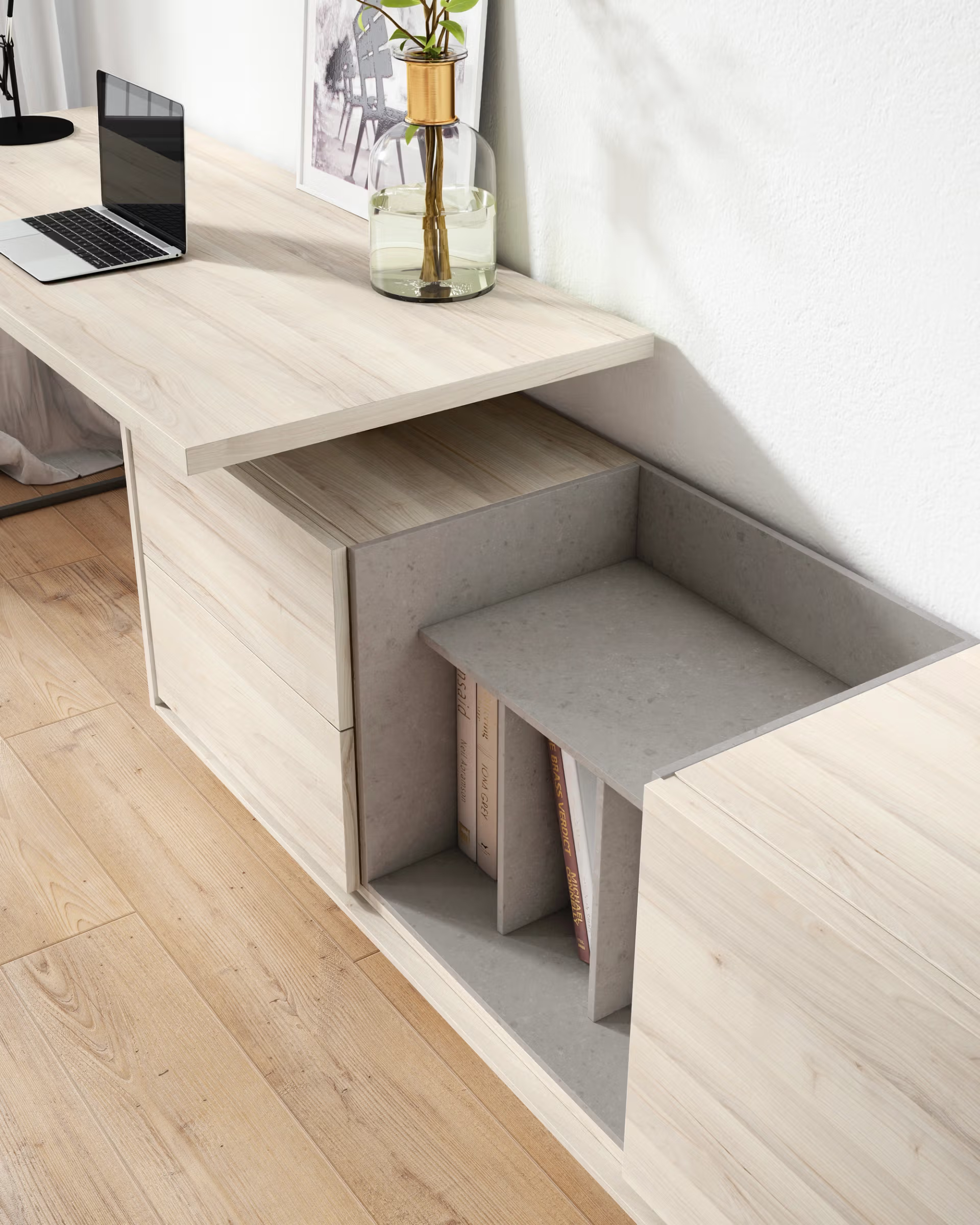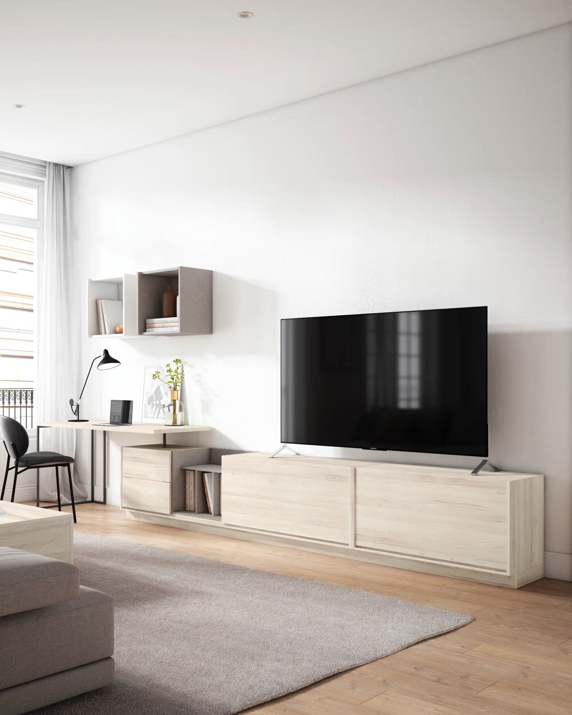 El mueble de salón presenta un diseño moderno y funcional, compuesto por módulos en tonos madera clara y gris. Incluye una base baja con puertas correderas, ideal para almacenar objetos y mantener el espacio ordenado. A la derecha se sitúa un espacio para la televisión, mientras que el lateral izquierdo incorpora una zona de escritorio integrada, perfecta para trabajar o estudiar. Sobre la base, hay estantes y baldas, algunos con puerta, que aportan capacidad extra para libros y decoración. Su acabado en líneas rectas y colores neutros lo hace versátil y elegante para cualquier salón contemporáneo.