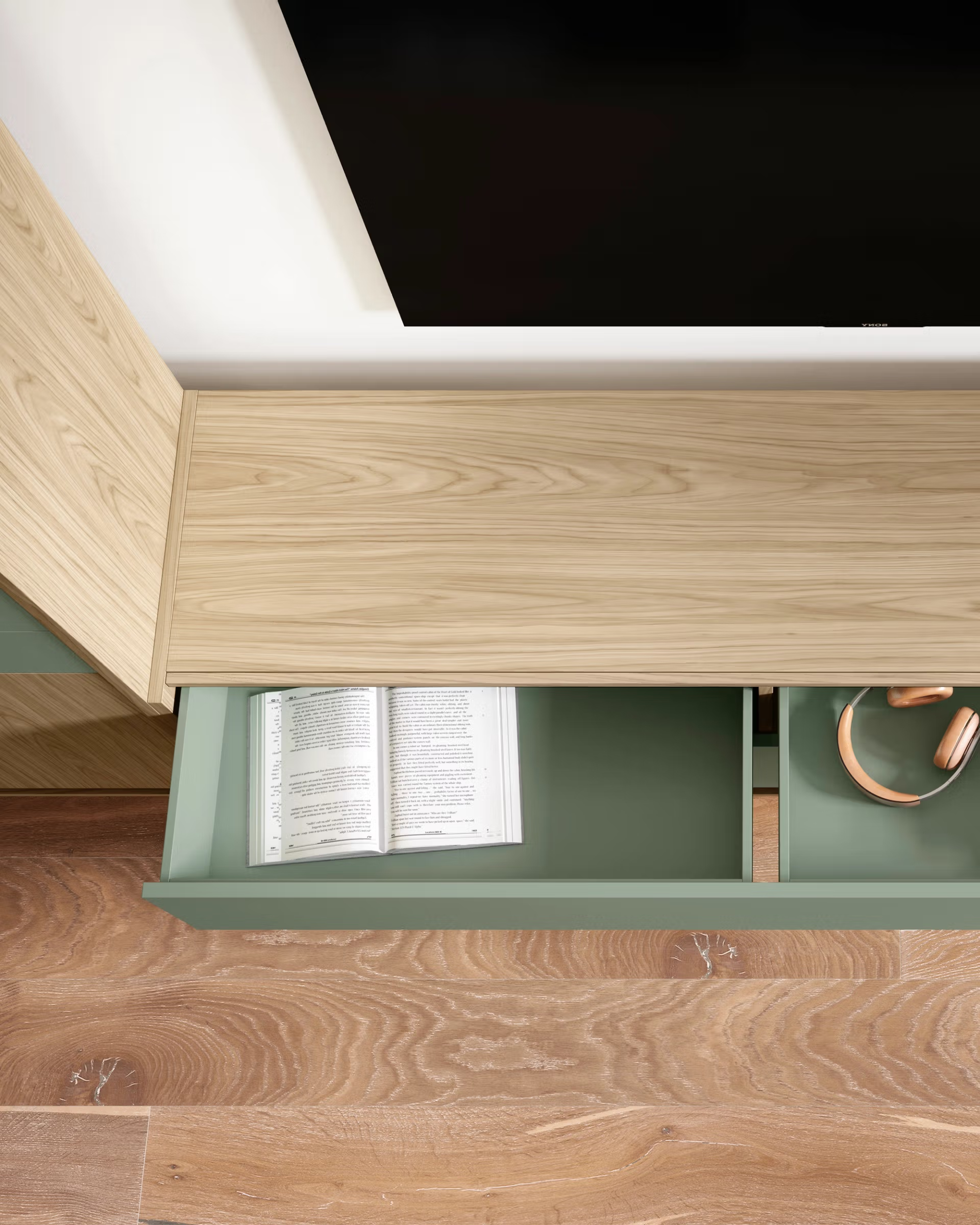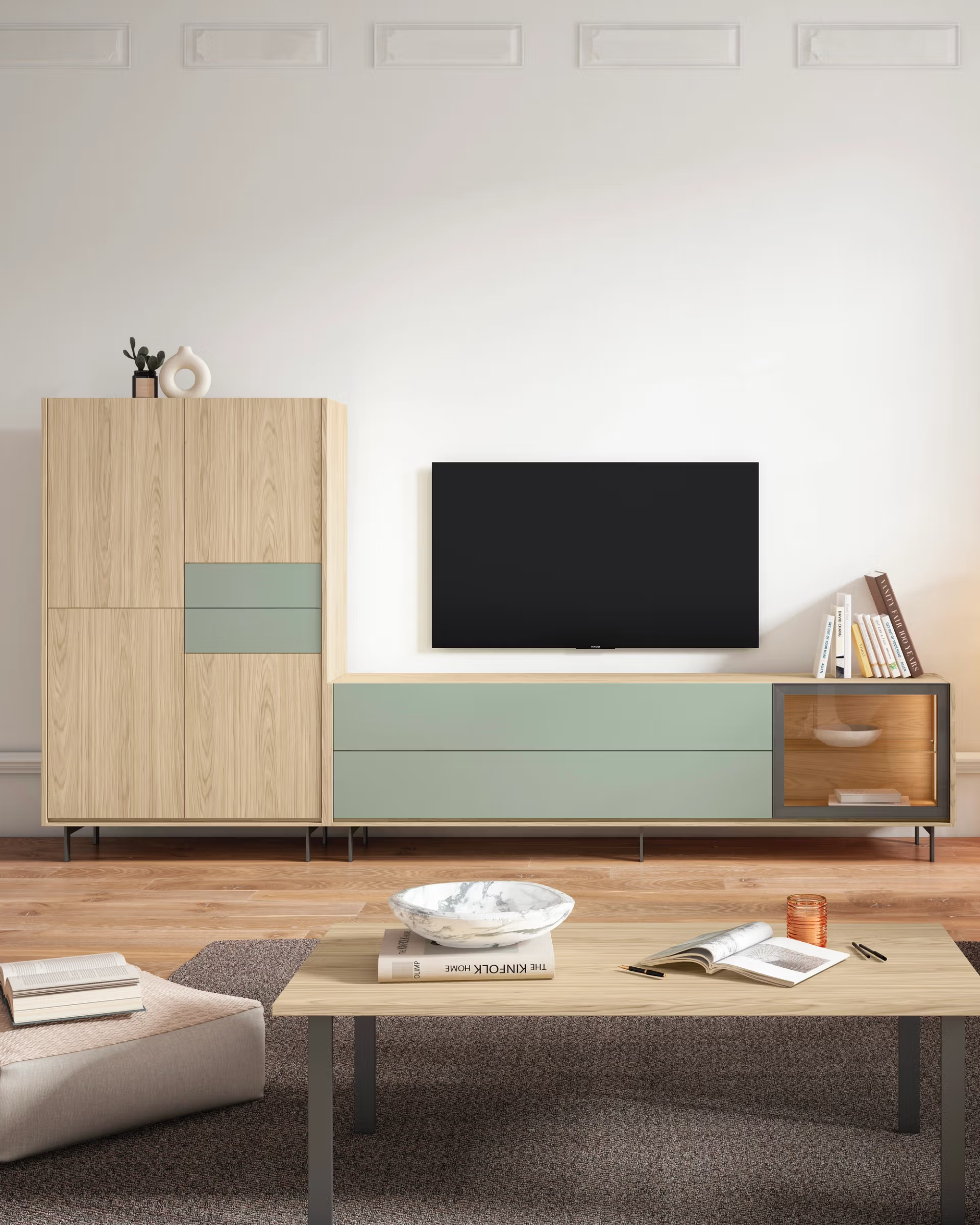 Composición de salón moderna de líneas sencillas y diseño minimalista. Está formada por dos módulos principales: uno vertical tipo vitrina con puertas lisas y detalles en verde mate, y otro horizontal bajo con dos amplios cajones y una vitrina lateral con puerta de cristal. Realizado en madera clara que aporta calidez y combina con frentes en tono verde suave, creando una atmósfera elegante y acogedora. Sus patas metálicas elevan el conjunto, facilitando la limpieza y dando un toque ligero. Es ideal para almacenar, organizar y exhibir objetos decorativos, adaptándose a salones contemporáneos y funcionales.