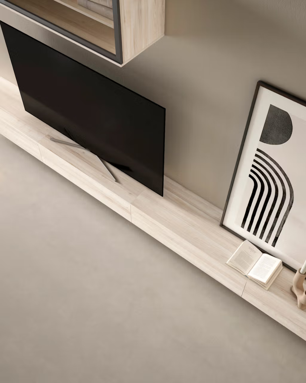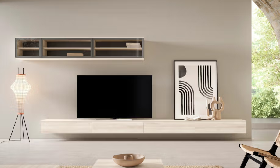 • Mueble bajo suspendido, de líneas rectas, acabado en tono madera clara con vetas horizontales visibles. • Conjunto formado por tres módulos inferiores con mecanismo de apertura tipo push, sin tiradores visibles. • Módulo superior suspendido, compuesto por dos secciones con puertas de cristal templado translúcido y marco metálico oscuro. • Interior de los módulos superiores con estanterías de tablero de madera, optimizando el espacio de almacenaje y exhibición. • Sistema de fijación invisible a pared tanto para los módulos altos como bajos, proporcionando un efecto flotante. • Tapa superior del mueble bajo con acabado uniforme, apta para la colocación de televisor y otros dispositivos multimedia. • Fondo del conjunto en tono neutro, creando contraste visual suave con el color del mueble y realzando la integración en el espacio. • Diseño modular adaptable, lo que permite reorganizar los módulos según las necesidades de espacio y funcionalidad.