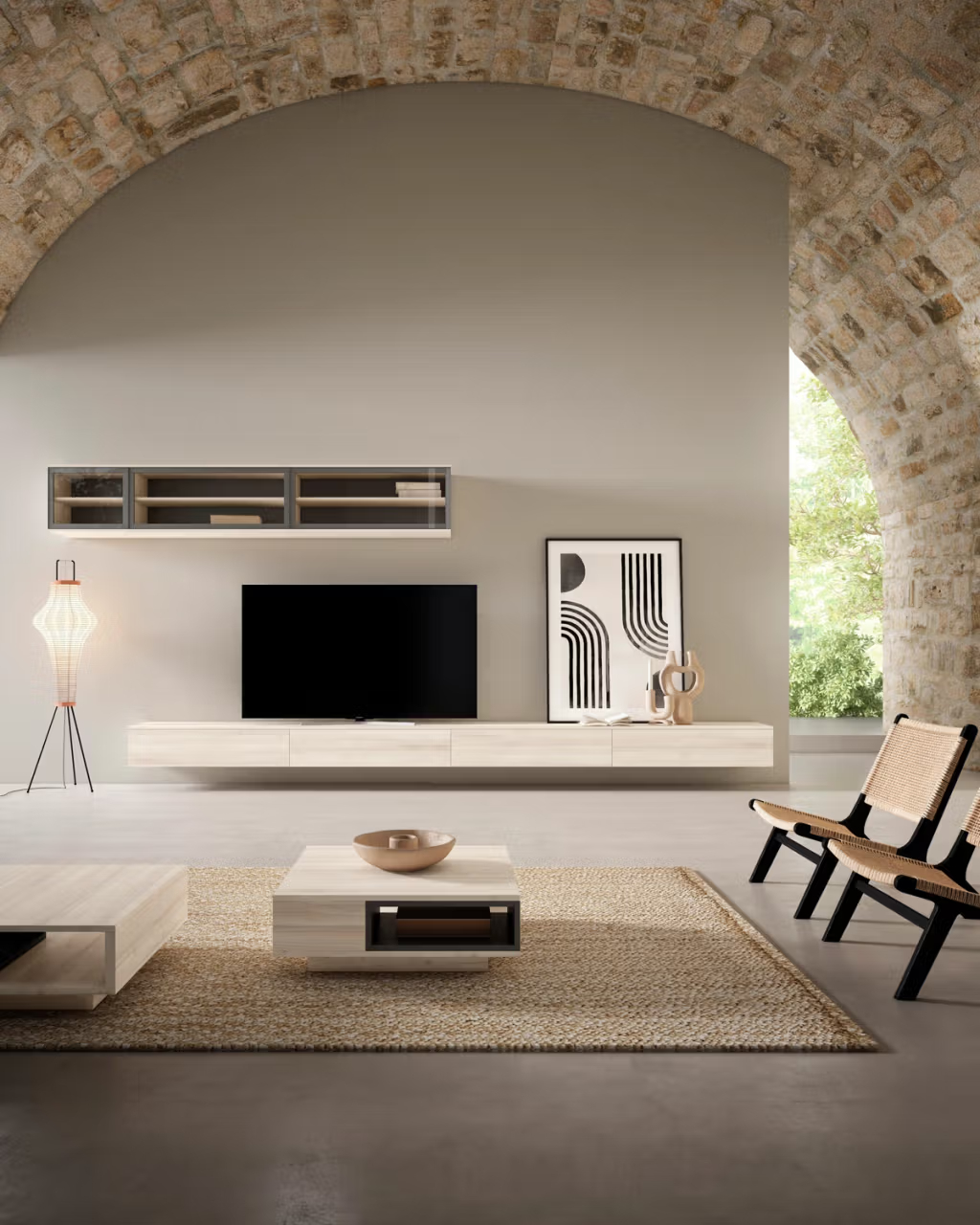 Una composición dónde los muebles de televisión simétricos y proporcionados se colocan de forma centralizada y en la misma altura, flanqueados por los colgantes. Los elementos se distribuyen de manera simétrica, creando una sensación de armonía y coherencia visual en el salón. Las puertas elevables de aluminio y cristal son una opción elegante y funcional de apertura fácil y suave.
