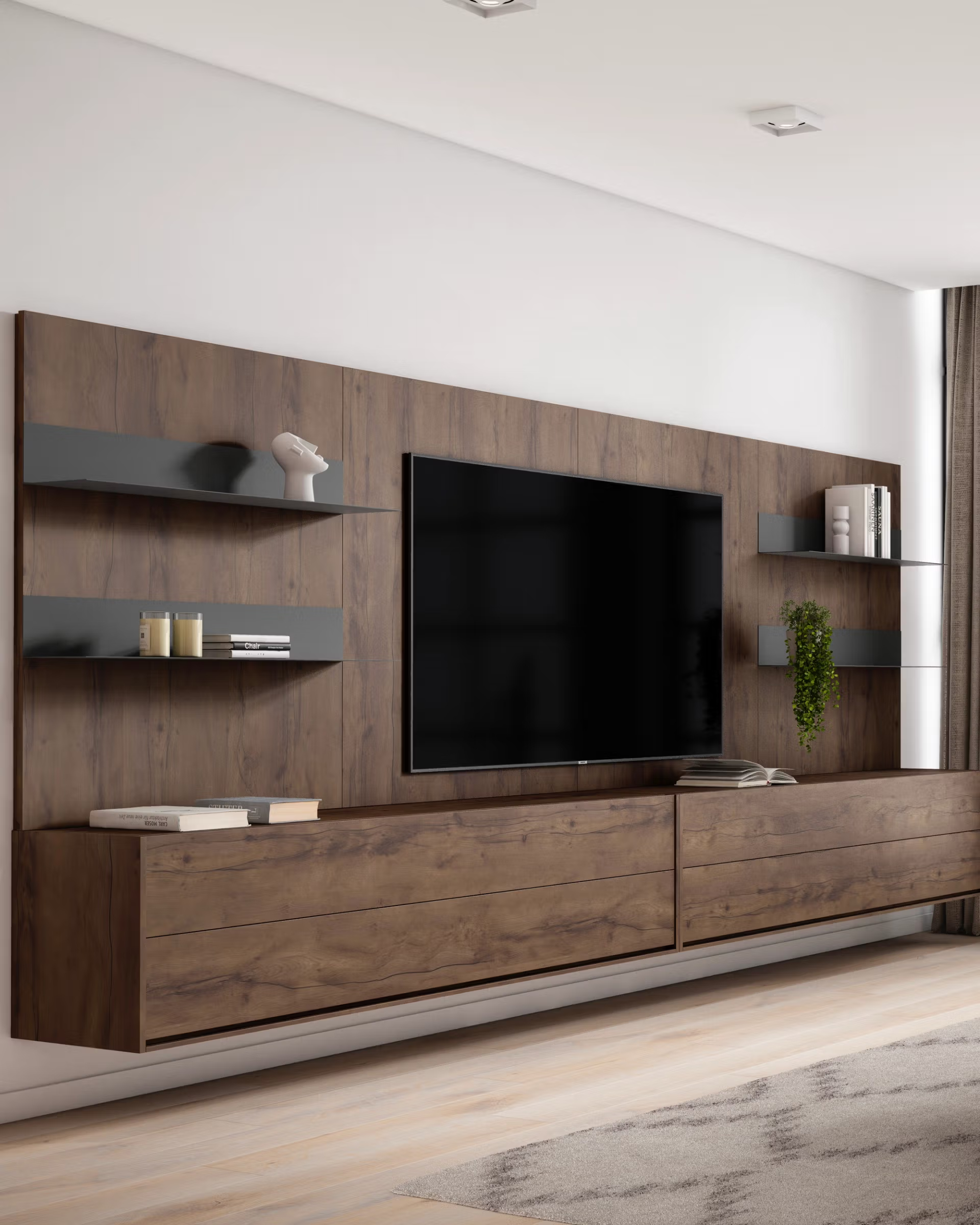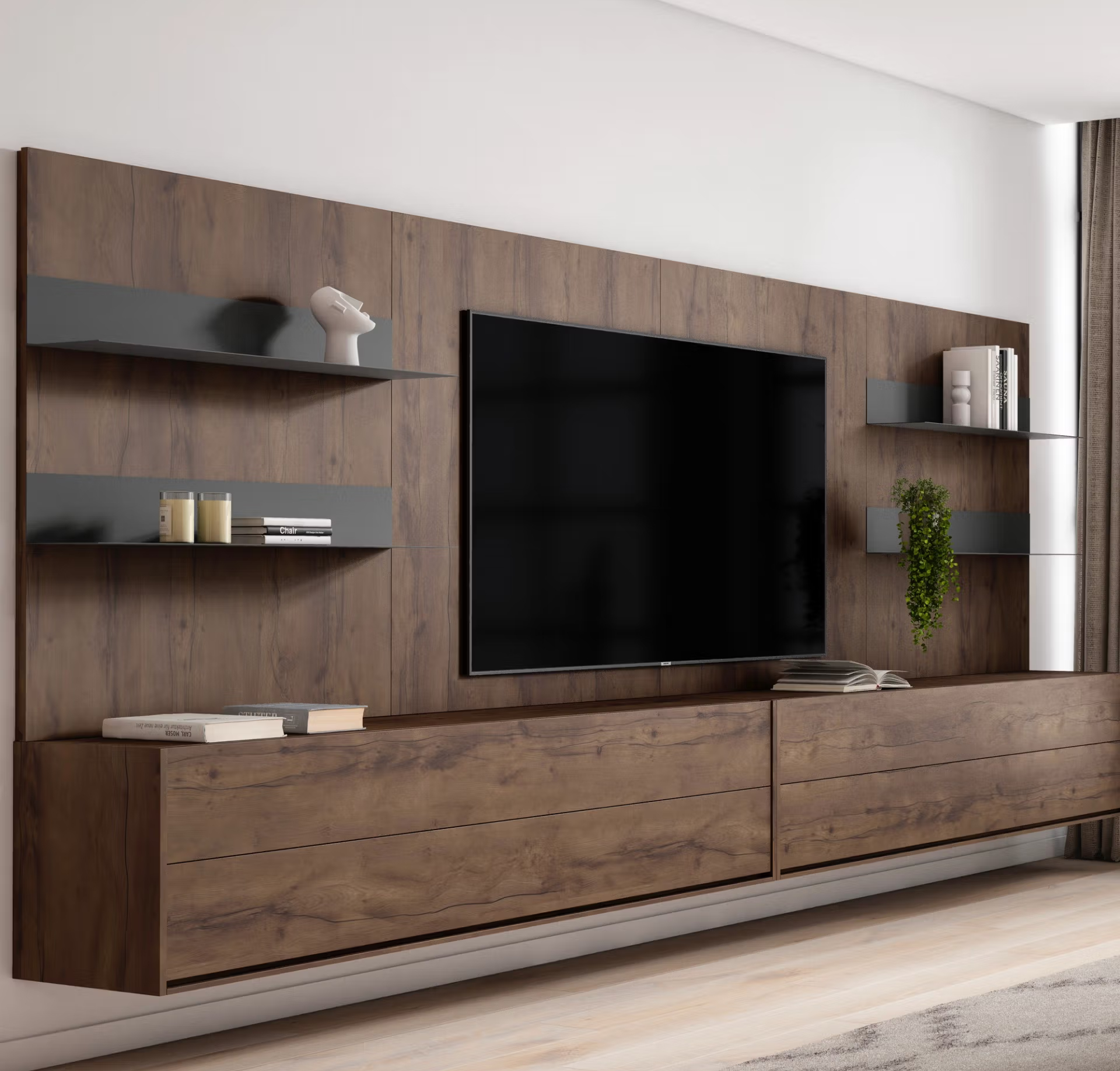 Composición de salón moderna en madera, con panel y baldas en gris oscuro. Incluye almacenaje inferior amplio, estanterías decorativas y espacio central para televisor. Diseño elegante y funcional, ideal para espacios contemporáneos.