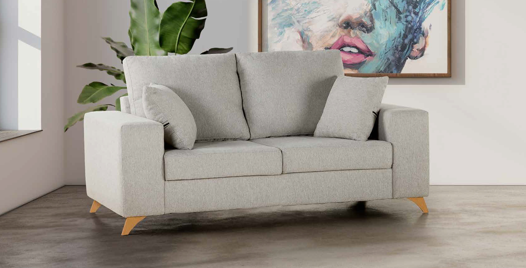El Fiordo es un sofá de diseño moderno con líneas limpias y elegantes, perfecto para cualquier salón contemporáneo. Está tapizado en una tela gris clara que aporta luminosidad y combina fácilmente con otros estilos decorativos. Sus asientos y respaldos están confeccionados con cojines gruesos y mullidos que aseguran comodidad y apoyo óptimo durante el descanso. Los reposabrazos rectos realzan su perfil actual, mientras que las patas de madera inclinadas añaden un toque cálido y natural, además de facilitar la limpieza debajo del sofá. Es ideal para dos o tres personas y destaca por su funcionalidad y estética equilibrada.