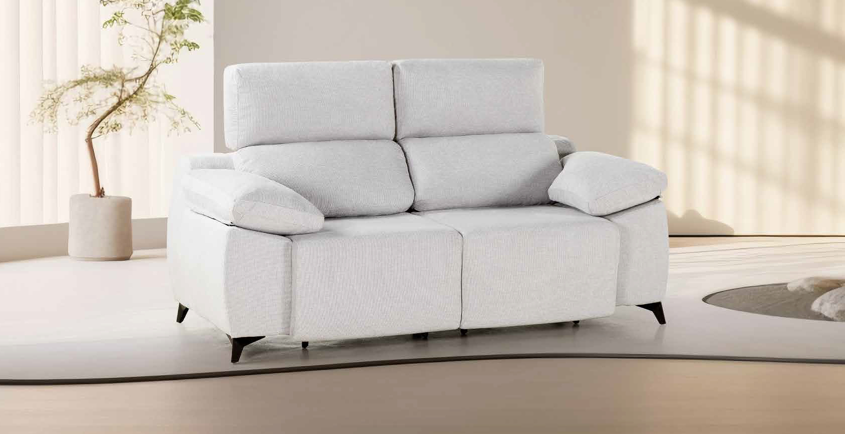 Sofá tapizado en tela clara, de diseño moderno y líneas rectas, con asientos amplios y cabezales ajustables. Perfecto para dos personas, ideal para salones contemporáneos por su estilo elegante y funcional.