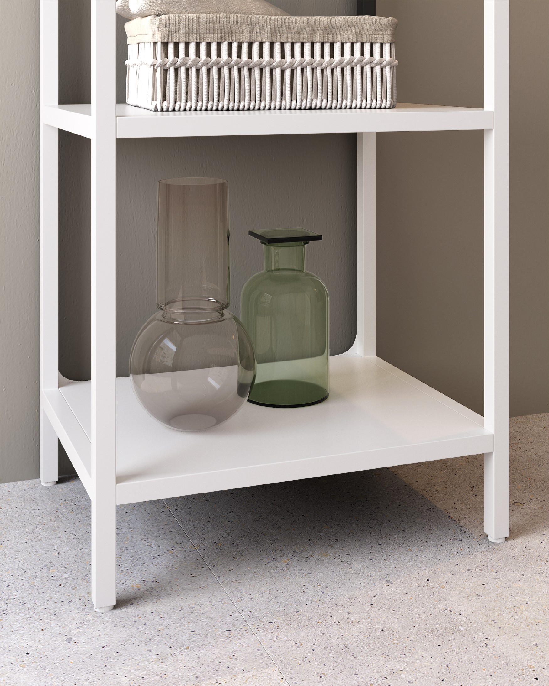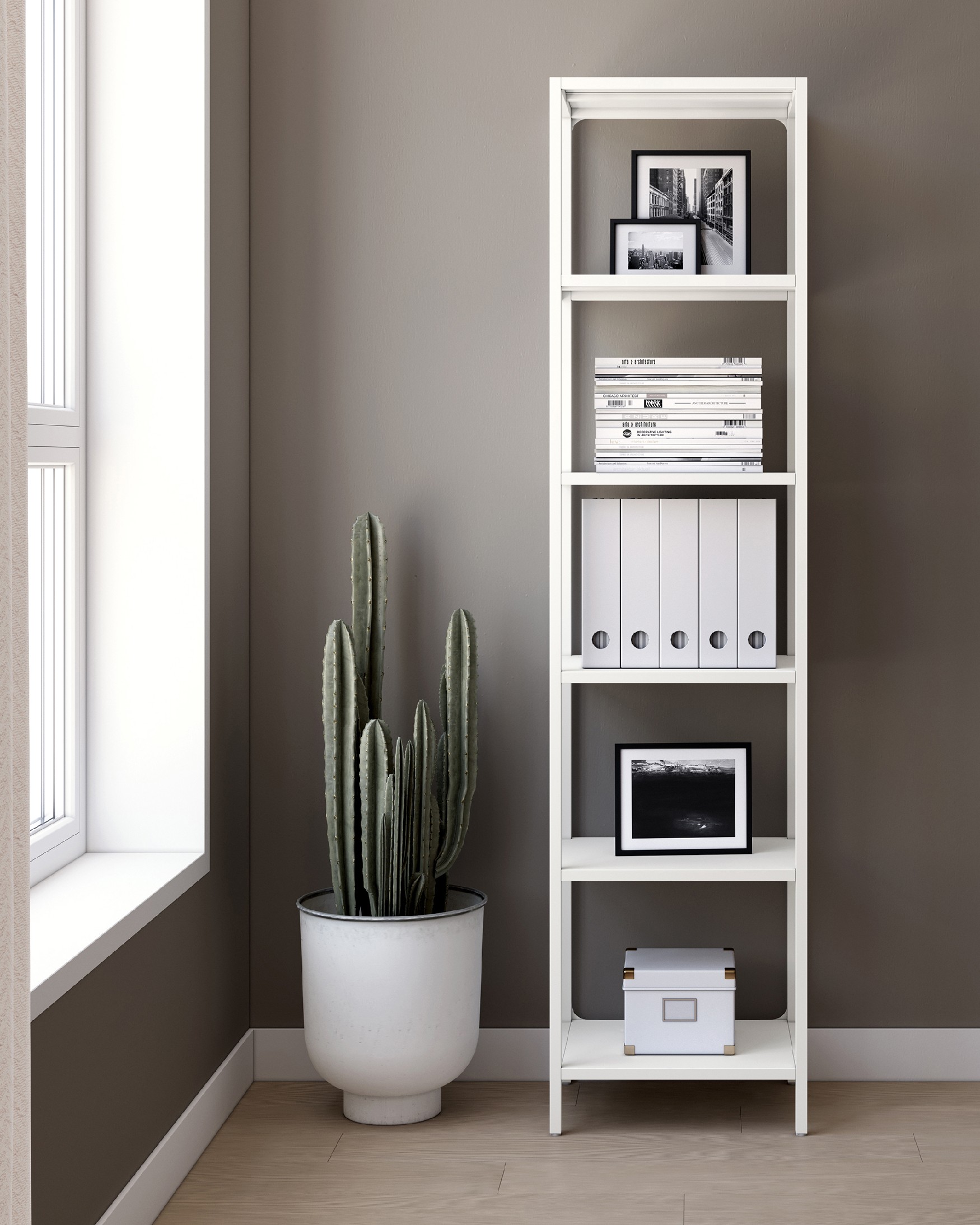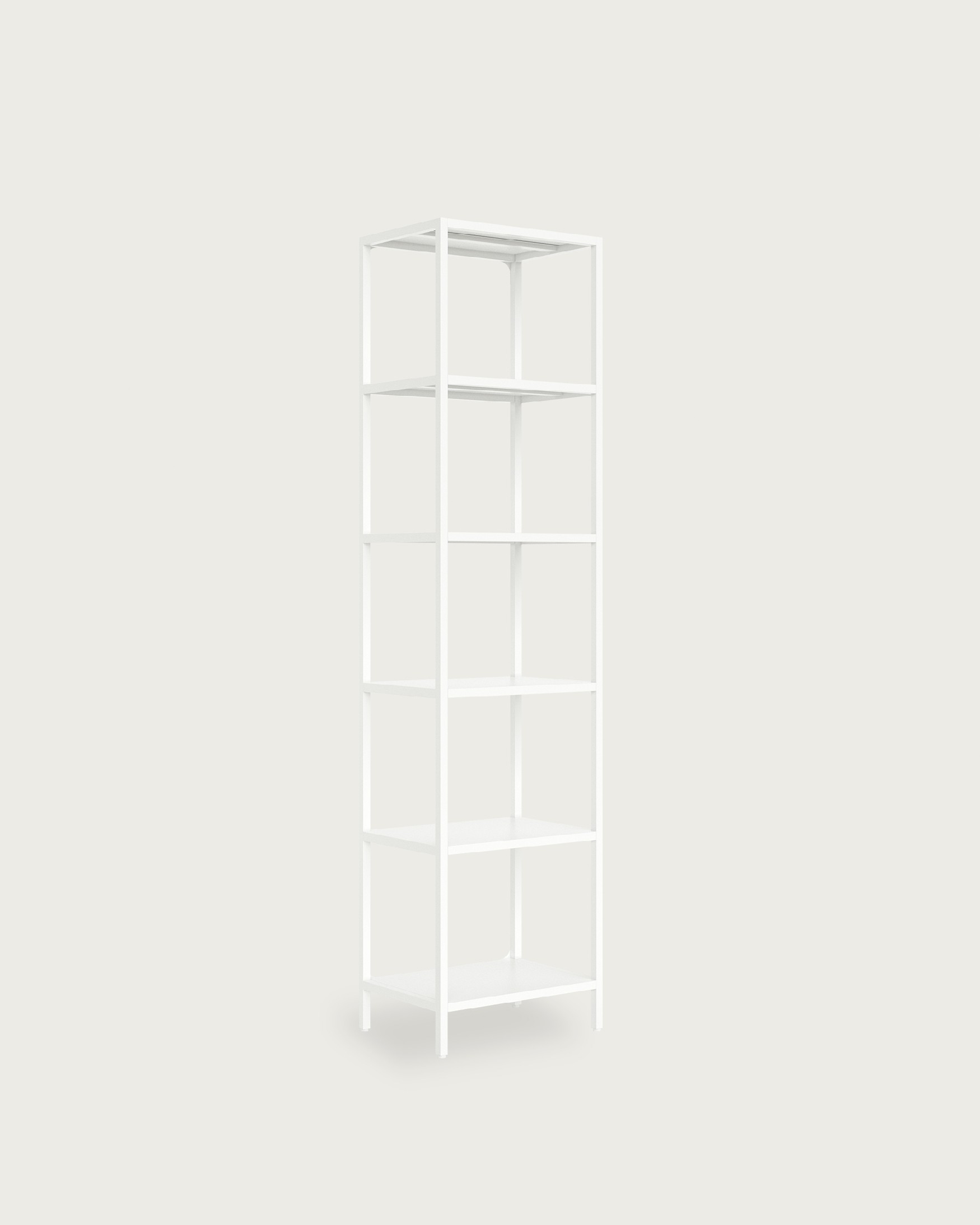 Estantería metálica alta y estrecha, de color blanco mate, con cinco baldas abiertas que aportan ligereza visual. Ideal para organizar libros, cajas o decoración en salones, despachos o trasteros, aprovechando al máximo el espacio vertical.