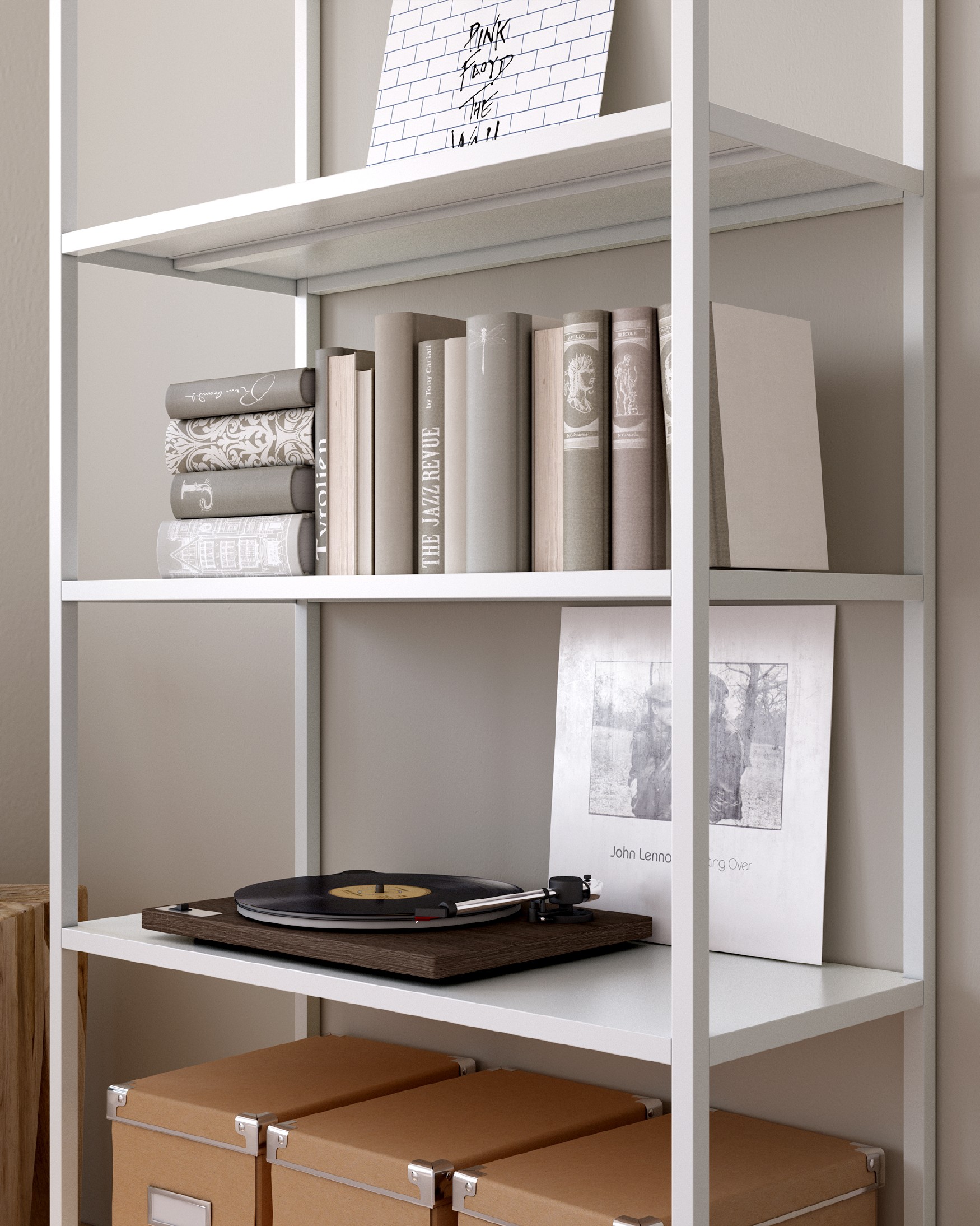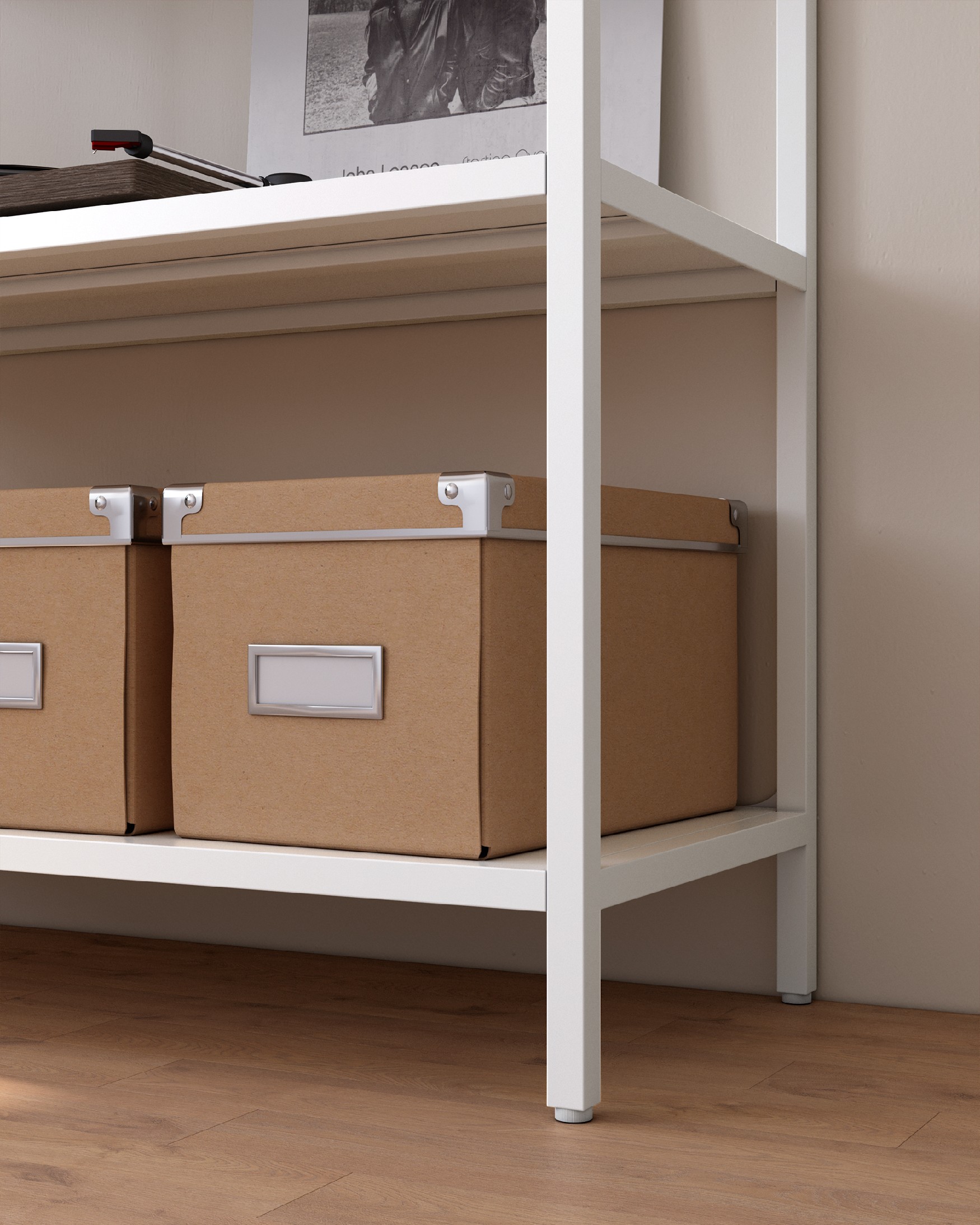 La estantería TITANIA está fabricada íntegramente en metal, con estructura y baldas metálicas, lo que le da una gran resistencia y un aspecto moderno.