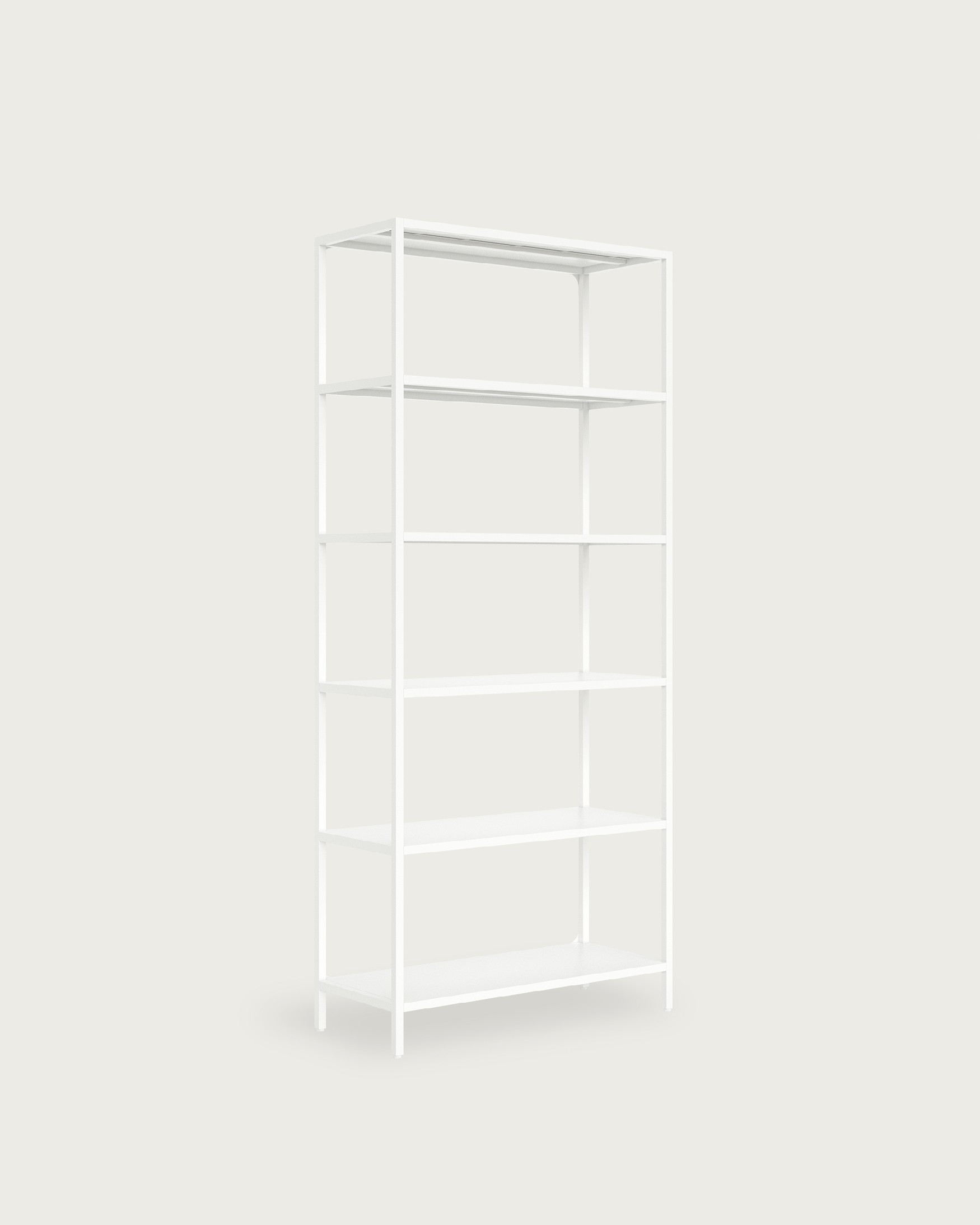 Estantería metálica blanca de líneas puras y diseño minimalista, perfecta para aportar ligereza visual a cualquier estancia. Con una estructura robusta y esbelta, ofrece cinco baldas amplias y fijas, ideales para organizar libros, cajas o elementos decorativos sin recargar el espacio. Sus proporciones estilizadas la hacen adecuada tanto para salones contemporáneos como para despachos u oficinas de estilo nórdico o industrial suave. El acabado en blanco mate facilita la combinación con otros muebles y colores, creando ambientes luminosos, ordenados y funcionales