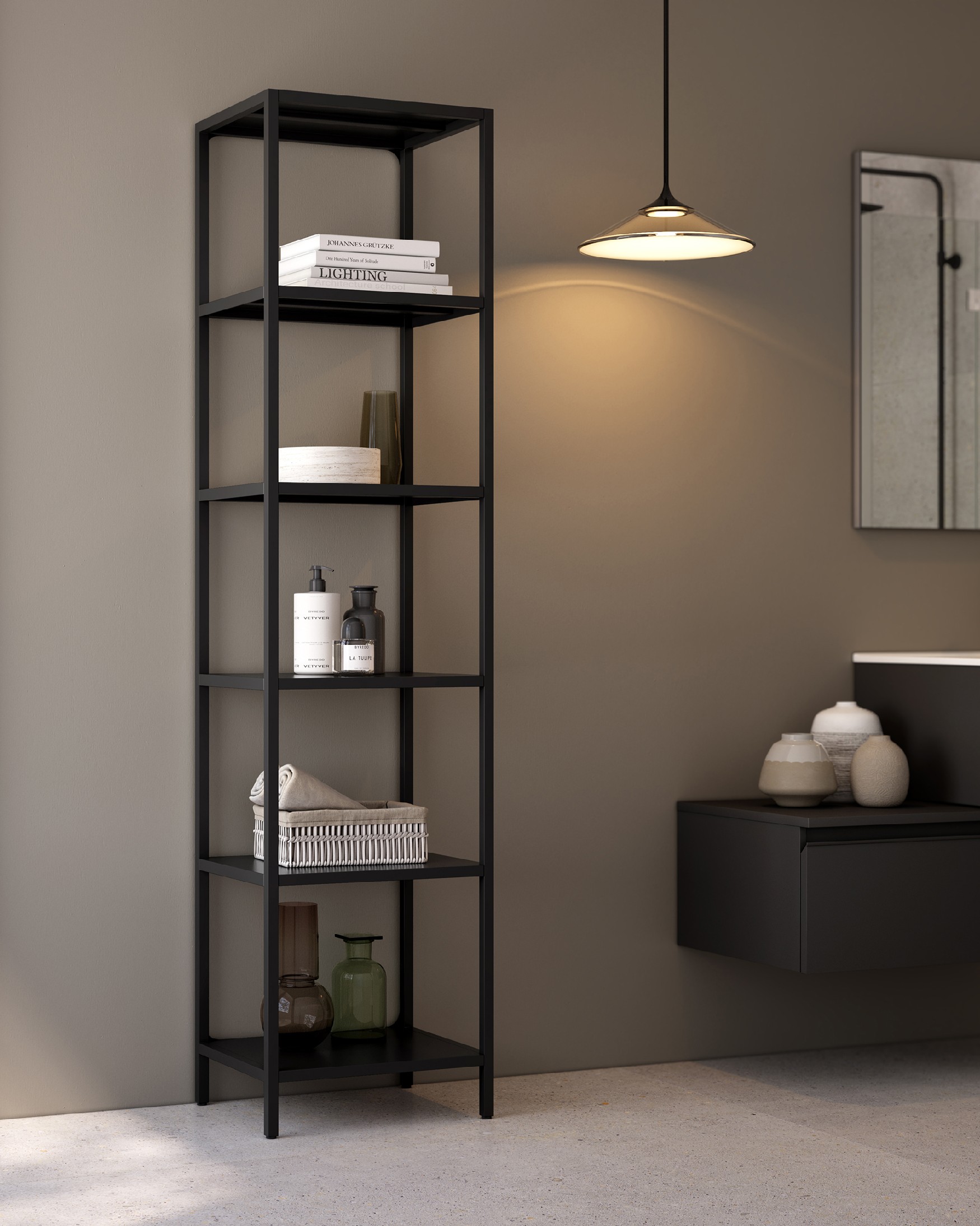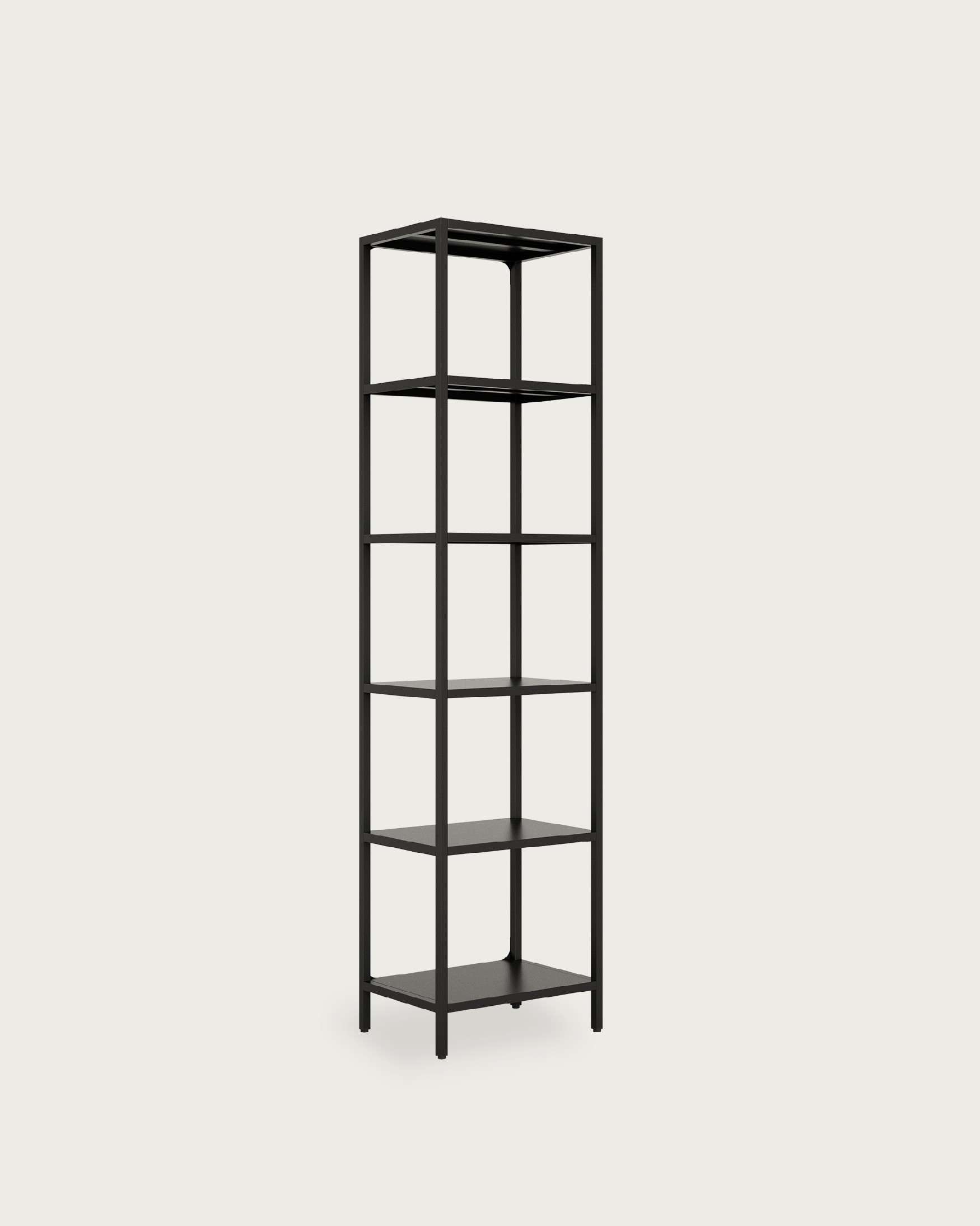 Estantería alta y estrecha de metal negro con diseño minimalista y líneas rectas, ideal para espacios pequeños. Ofrece varios estantes abiertos para libros, cajas o decoración, aportando un toque moderno y ligero a cualquier estancia.