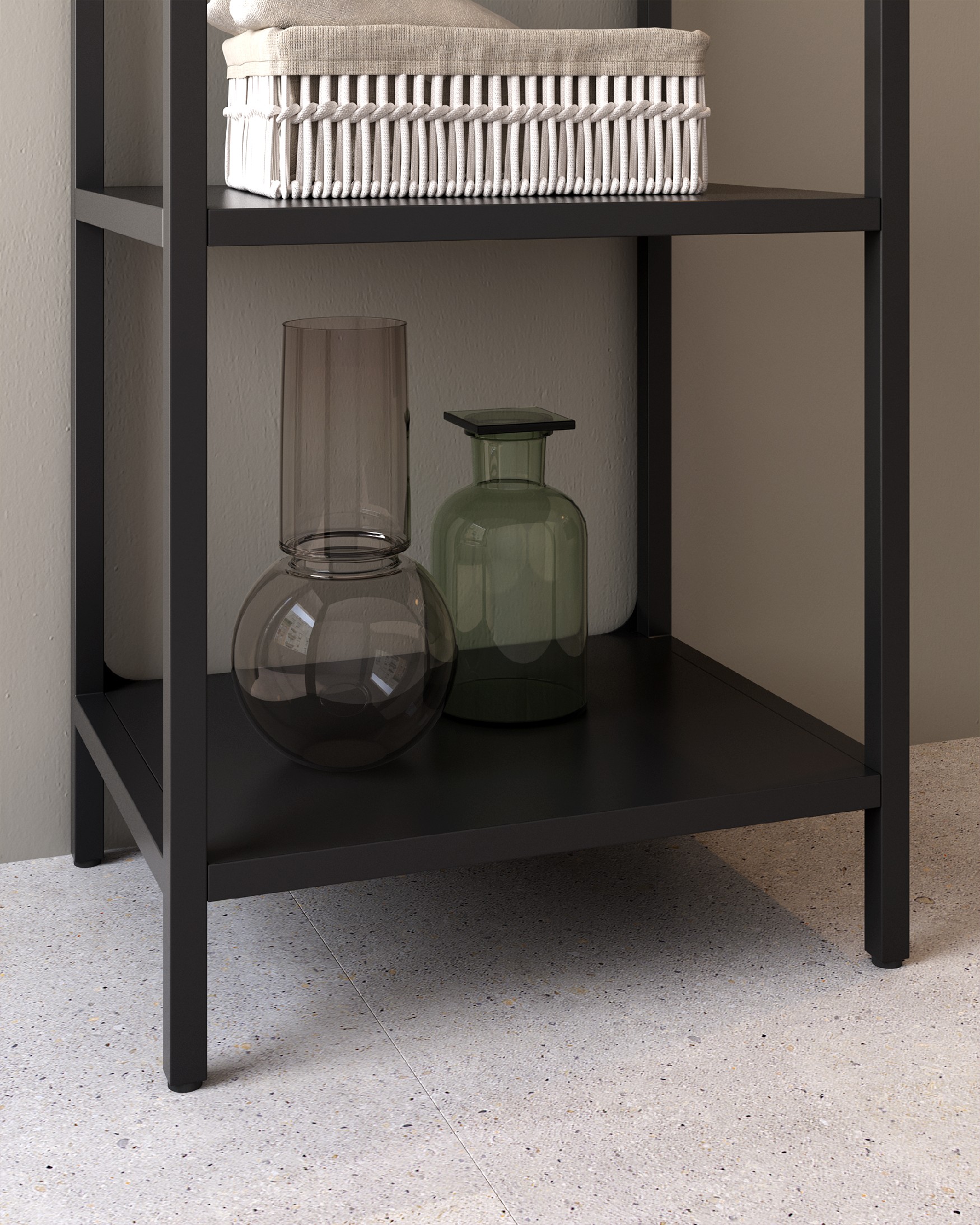Su forma vertical y abierta aprovecha bien el espacio en altura, ideal para rincones pequeños. Además, el acabado negro combina fácilmente con estilos modernos, industriales o minimalistas.