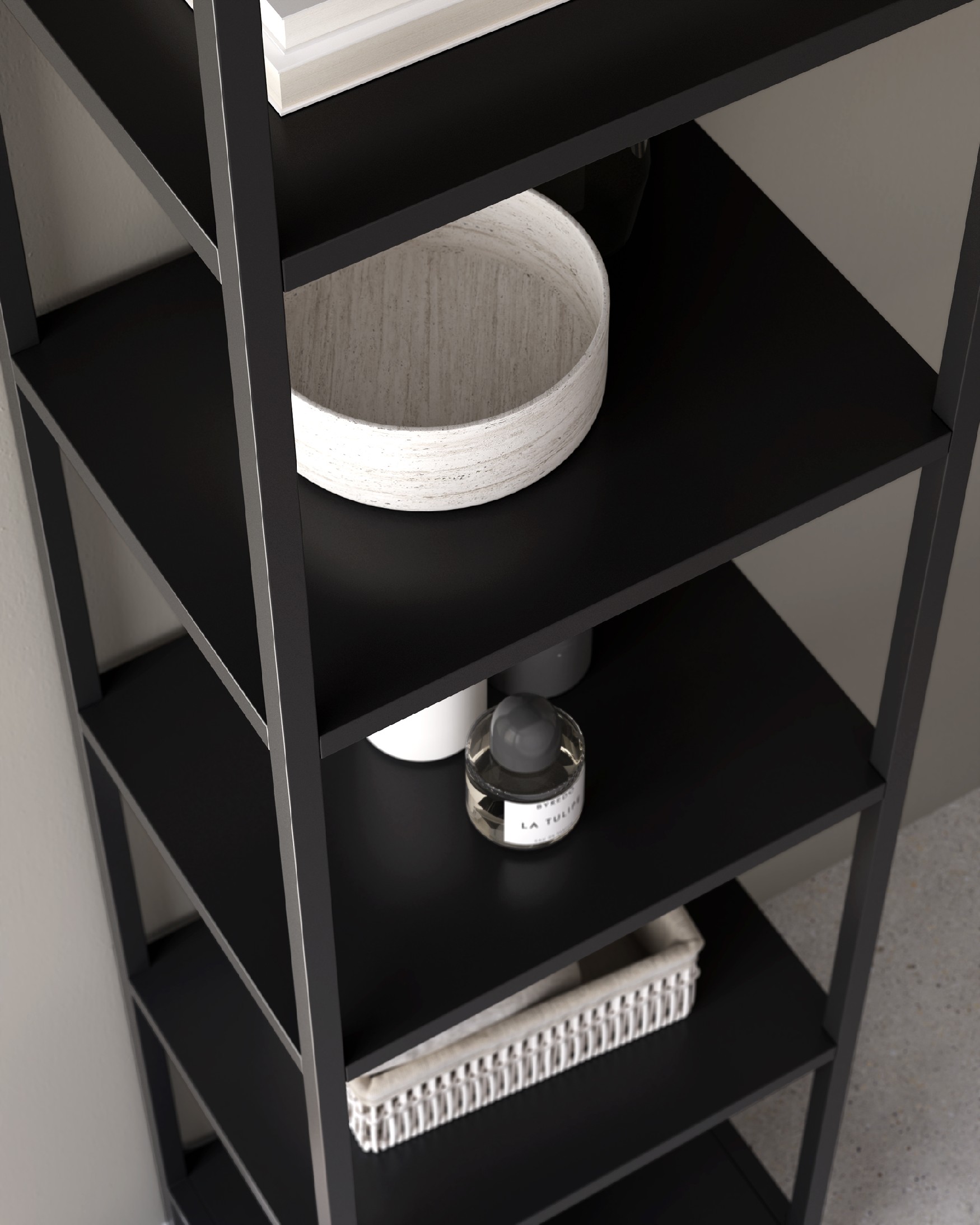La estantería negra Titania es una pieza alta y esbelta de diseño minimalista, perfecta para aprovechar el espacio en vertical sin recargar la estancia. Fabricada íntegramente en metal lacado en negro, ofrece una estructura robusta con líneas rectas y limpias que encajan muy bien en interiores modernos o de estilo industrial. Dispone de seis baldas fijas que proporcionan amplia superficie para libros, cajas de almacenaje u objetos decorativos, manteniendo todo ordenado y visible. Su fondo contenido permite colocarla en pasillos, salones o despachos sin invadir el paso, mientras que las patas finas levantan ligeramente el mueble del suelo, aportando ligereza visual. Es una solución funcional y decorativa para quienes buscan un mueble práctico, resistente y con un acabado elegante en negro mate.