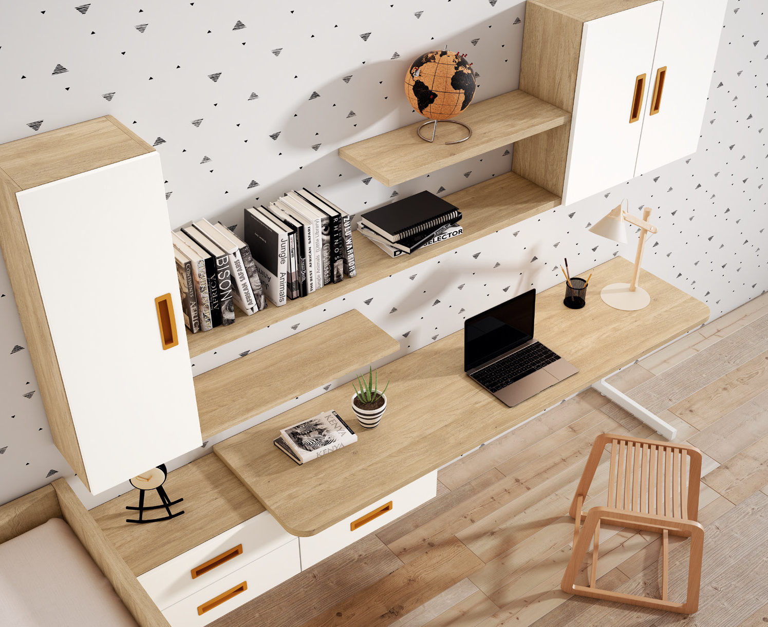 El mobiliario del dormitorio destaca por un equilibrio elegante entre modernidad y funcionalidad. La cama, con líneas puras y acabados en madera clara y blanco, presenta cajones espaciosos integrados en la base para maximizar el almacenamiento sin renunciar al diseño sofisticado. El conjunto se complementa con un escritorio de líneas rectas y superficie amplia, acompañado de cajones de gran capacidad y tiradores en tono cálido que aportan un acento visual refinado. Sobre el escritorio, estanterías y armarios suspendidos en los mismos tonos generan una composición armoniosa y funcional, ideal tanto para el estudio como para exponer libros y objetos personales. Para finalizar, un taburete de diseño minimalista en madera completa el espacio, sumando un toque contemporáneo sin perder la elegancia natural del conjunto.