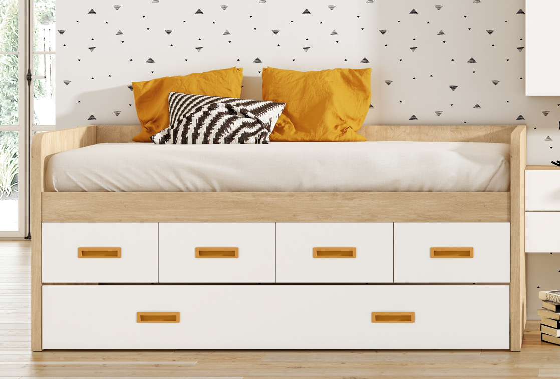 El mobiliario del dormitorio presenta un diseño moderno y funcional, con una cama nido de líneas rectas y acabados en madera clara y blanco. Los cajones, armarios y estanterías combinan superficies blancas con tiradores en tono mostaza, logrando una elegancia cálida y armoniosa. El escritorio incorpora una amplia superficie de trabajo y una práctica banqueta de madera.