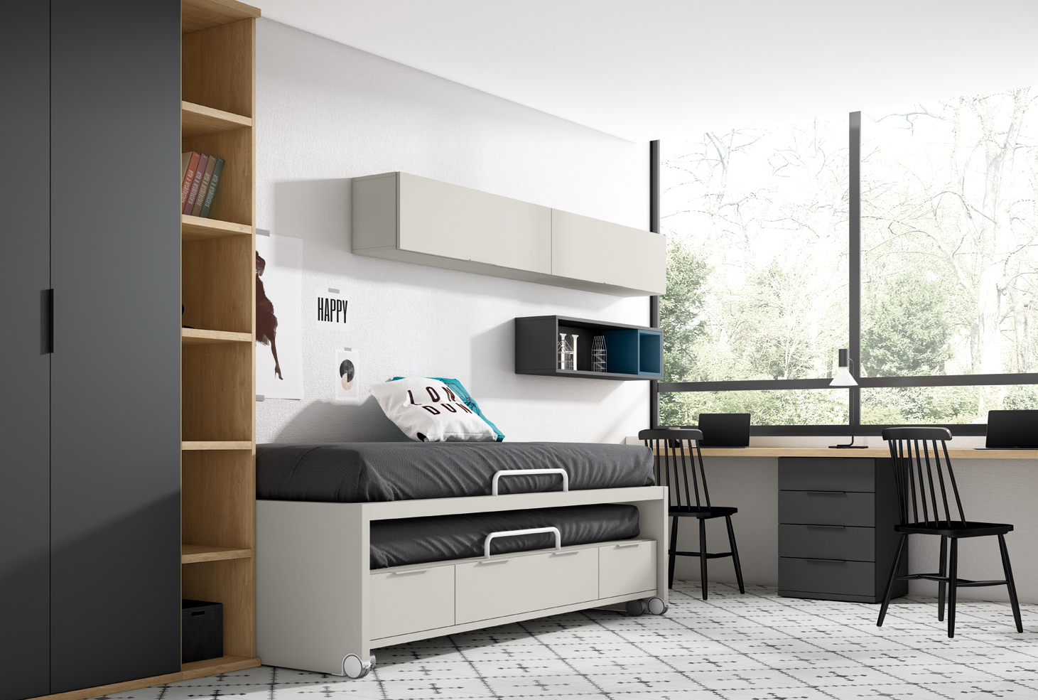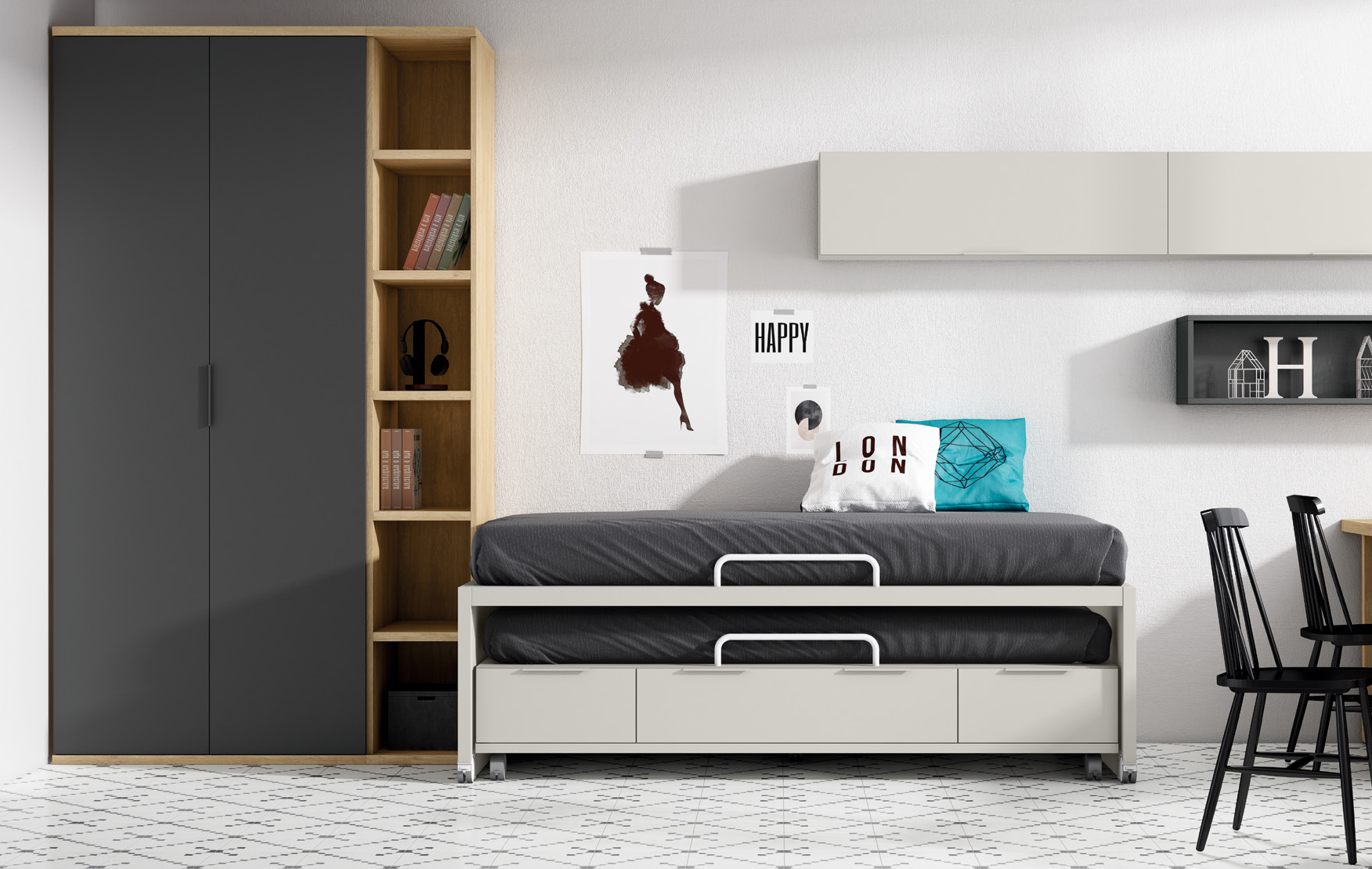 El mobiliario del dormitorio desprende un aire contemporáneo y funcional, marcado por líneas rectas y acabados elegantes. Destaca la cama nido de diseño minimalista en tonos claros, con dos colchones superpuestos y prácticos cajones inferiores que ofrecen espacio extra de almacenaje, rematada con discretas asas metálicas. Junto a ella, una amplia estantería de madera natural combina compartimentos abiertos para libros y objetos personales, fusionando calidez y modernidad. Sobre la cama, dos módulos suspendidos de almacenaje aportan uniformidad visual y orden, mientras una mesa de estudio alargada, con encimera de madera clara y cajonera gris, proporciona un espacio amplio y luminoso para el trabajo. Dos sillas negras clásicas añaden un toque de sofisticación al conjunto.