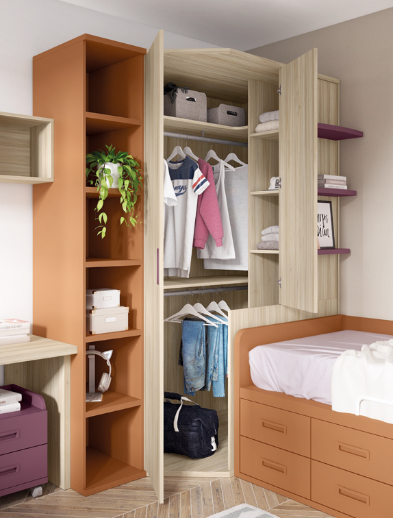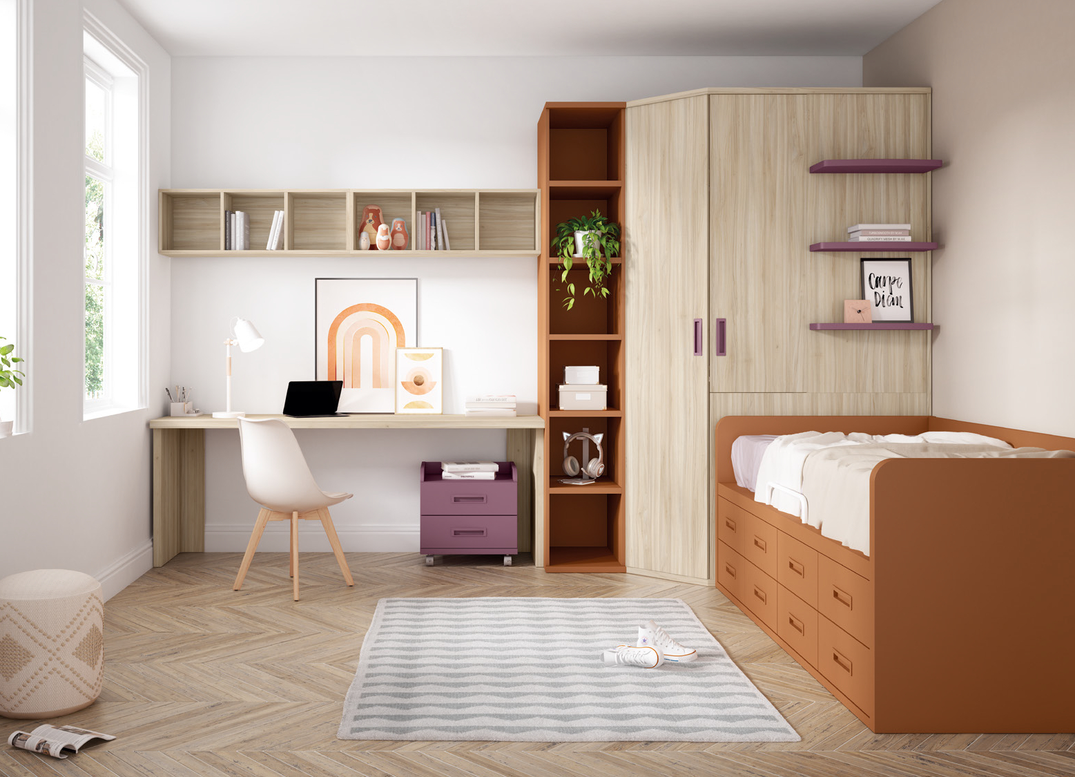 • Cama nido en color teja con almacenaje inferior compuesto por seis cajones amplios y tiradores integrados del mismo color. • Escritorio de madera clara de gran longitud, apoyado sobre costados rectos y acoplado lateralmente al conjunto de armario. • Silla blanca de líneas curvas y patas de madera clara. • Módulo bajo de cajonera, con dos cajones en tono violeta y tiradores integrados, colocado bajo el escritorio y con ruedas. • Estantería mural larga de baldas abiertas, realizada en madera clara, ubicada sobre el escritorio. • Armario rinconero de puertas abatibles en acabado madera clara, con tiradores verticales en color violeta. • Estantería vertical abierta en acabado teja, adosada junto al armario rinconero, con cinco huecos. • Tres baldas murales cortas en color violeta, instaladas sobre la pared junto a la cama, para almacenaje decorativo.