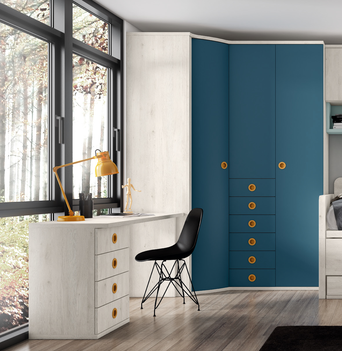 El dormitorio está amueblado con una cuidada selección de piezas modernas que derrochan elegancia y funcionalidad. El escritorio, de líneas rectas y acabado en madera clara, incluye una columna de cajones con tiradores circulares en color mostaza que aportan un toque contemporáneo. La silla negra con patas metálicas completa el rincón de estudio con un aire sofisticado. El armario rinconero destaca por sus puertas en azul intenso y tiradores a juego, ofreciendo amplitud y orden. Sobre la cama nido, también en madera clara con almacenaje inferior, se encuentra un módulo superior con armarios y baldas en tonos suaves. Todo el mobiliario crea un ambiente equilibrado, luminoso y distinguido.