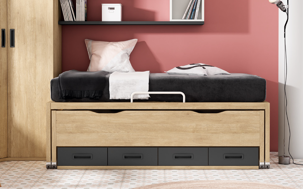 • Un escritorio de madera clara con estructura metálica blanca en uno de los laterales y estantes inferiores de almacenamiento. • Una silla de madera a juego con el escritorio, con asiento tapizado en color claro. • Un armario rincón de gran capacidad, acabado en madera clara, con asas negras verticales. • Una cama nido en madera clara, con barandilla metálica blanca, que dispone de una cama inferior extraíble y cuatro cajones en la parte inferior en color gris oscuro. • Un módulo de estantería abierto de color oscuro y blanco, colocado en la pared sobre la cama, con compartimentos para almacenar libros y objetos. Estos muebles proporcionan soluciones integradas para estudio, almacenamiento y descanso, todos combinados en tonos de madera clara y detalles en negro y gris oscuro, ofreciendo funcionalidad y cohesión visual en el dormitorio.