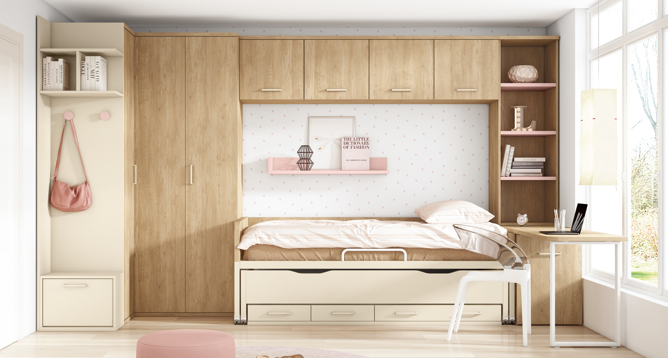 El dormitorio presenta un conjunto de muebles que combinan con elegancia madera natural y tonos crema. Destacan el armario empotrado con puertas lisas de madera clara, que aporta un estilo minimalista y funcional. Sobre la cama, integrada en el mobiliario, se encuentran varios armarios pequeños de puertas en crema que suman espacio de almacenaje discreto. La cama, tipo nido con cajones y ruedas, es práctica y eficiente en el uso del espacio, con un diseño limpio y sencillo. A la derecha, el escritorio continúa con la madera clara y cuenta con una estructura de soporte blanca, complementado con estantes abiertos que ofrecen funcionalidad y orden. En el lado izquierdo, un banco con cajón y panel con percheros en crema completa la armonía del conjunto. Esta combinación de muebles aporta una sensación de orden, calidez y confort.