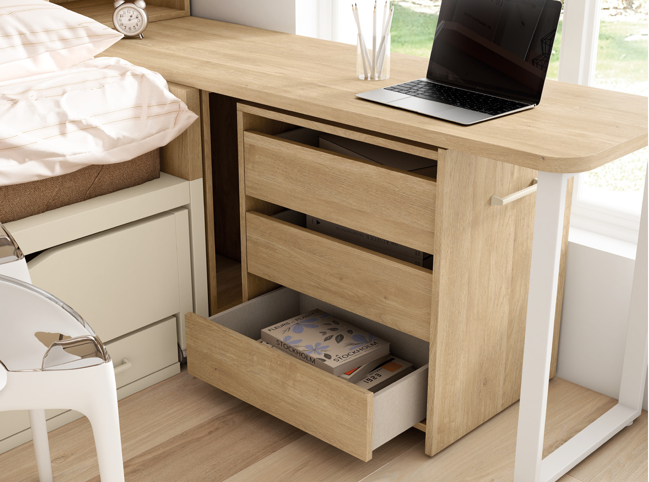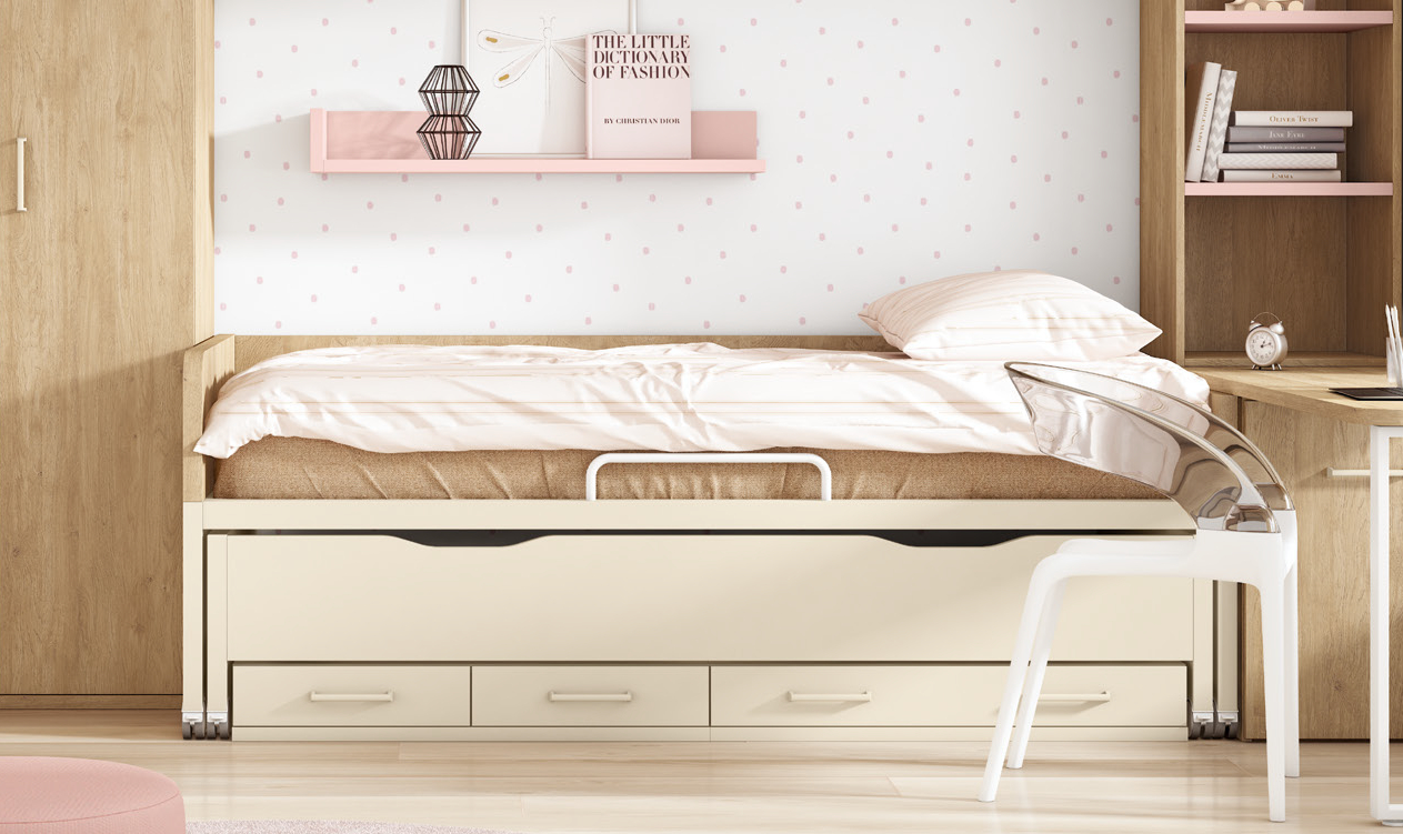 El dormitorio presenta una cuidada composición de muebles en tonos madera natural combinados con detalles en beige claro. Destacan el armario con puertas lisas, la cama nido con varios cajones y barra de seguridad, y un escritorio incorporado que se integra con una estantería abierta. Los tiradores metálicos minimalistas realzan la elegancia y funcionalidad del conjunto.