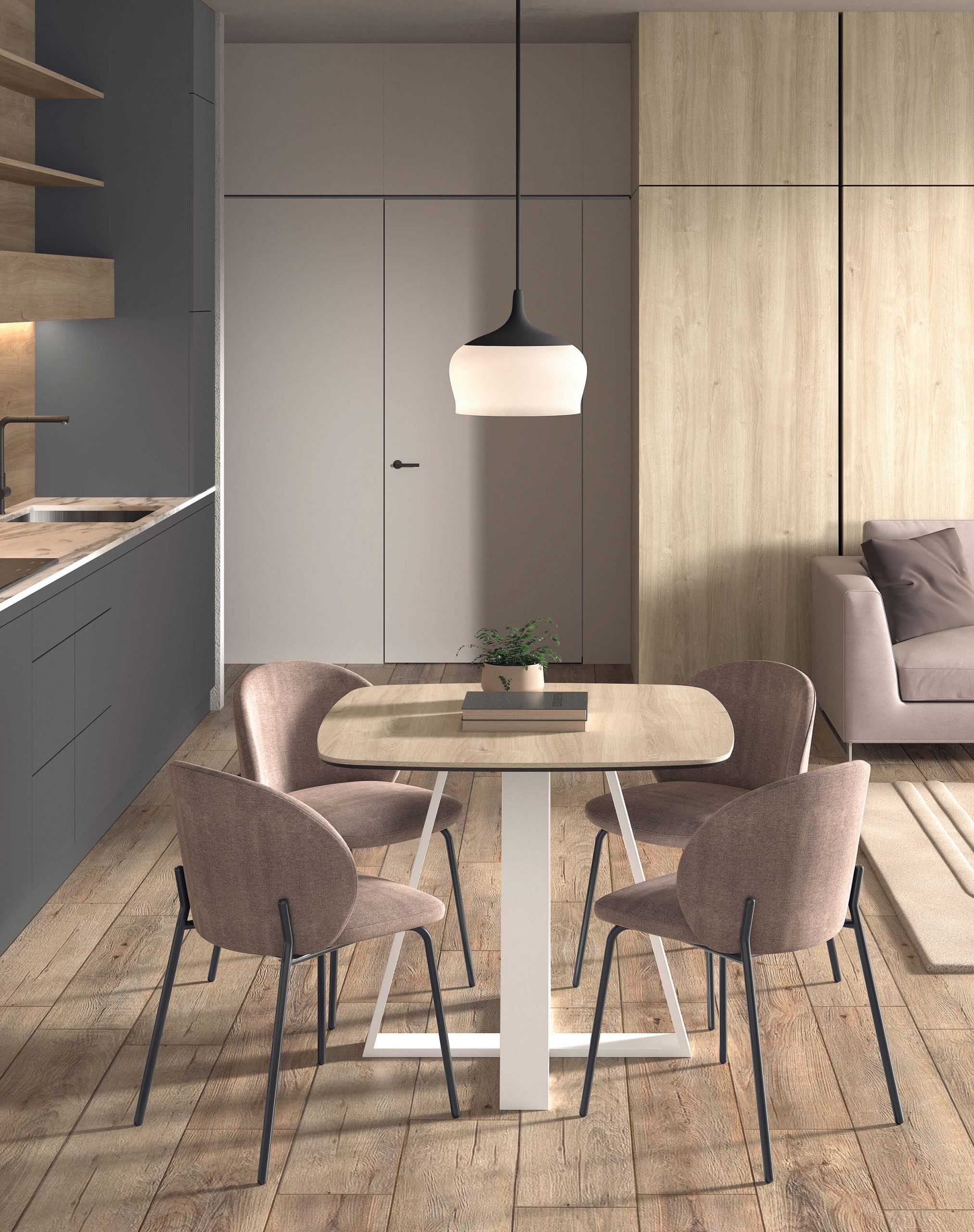 Esta mesa cuadrada de roble claro destaca por su diseño minimalista y funcional. Con una estructura de patas en forma de triángulo invertido en metal blanco lacado, ofrece estabilidad y un toque moderno. La tapa fija presenta un acabado natural en roble claro, con vetas visibles que aportan calidez y autenticidad al mueble. Sus proporciones compactas la hacen perfecta para comedores pequeños o cocinas, donde combina elegancia escandinava con practicidad cotidiana. Las patas elevadas permiten una fácil limpieza debajo, y el conjunto transmite solidez sin abrumar visualmente el entorno. Este modelo versátil se adapta a estilos contemporáneos, industriales o nórdicos, elevando cualquier rincón con su presencia serena y refinada.