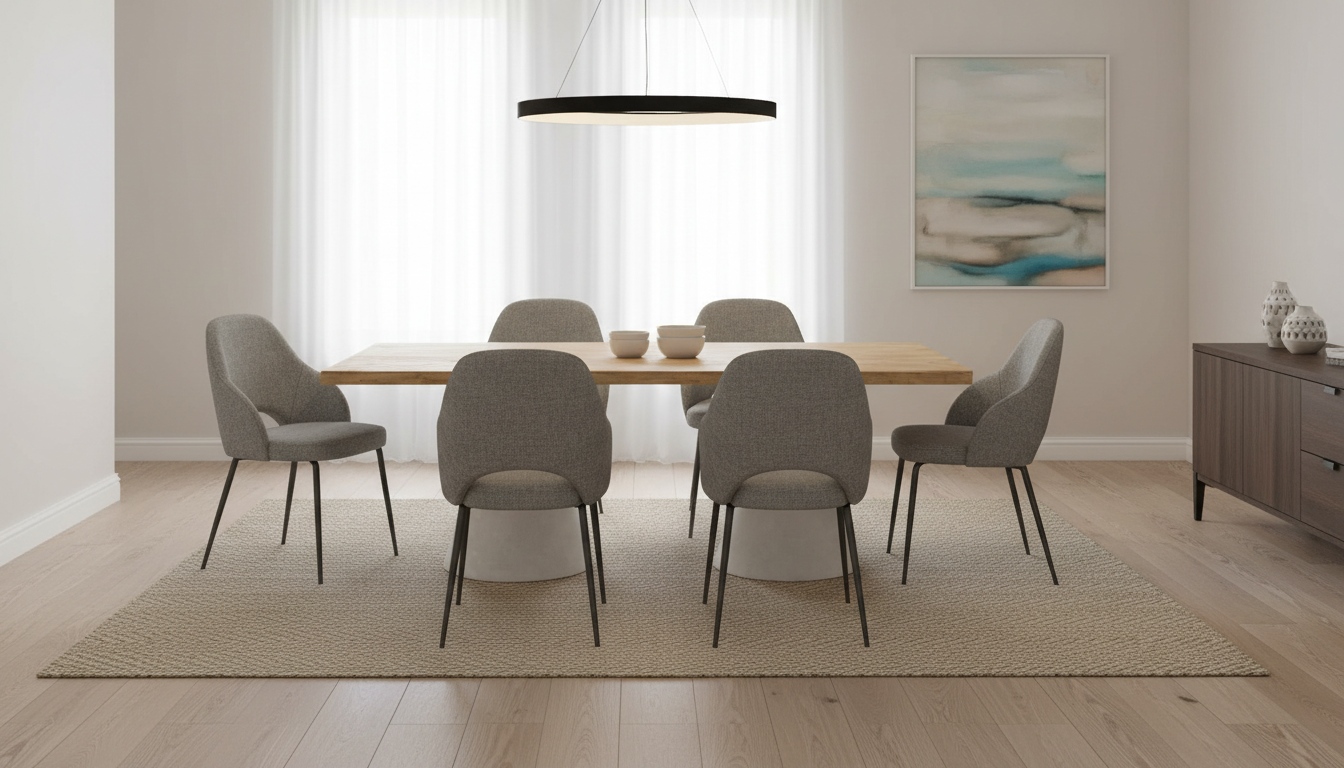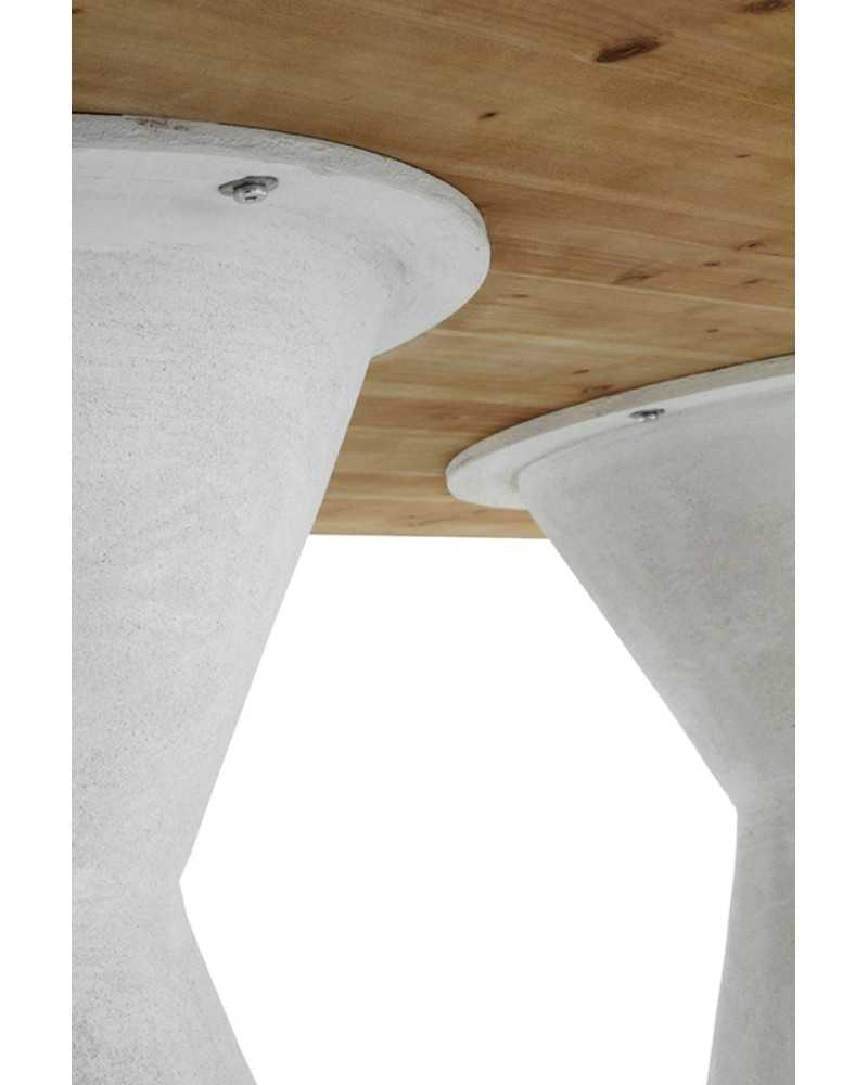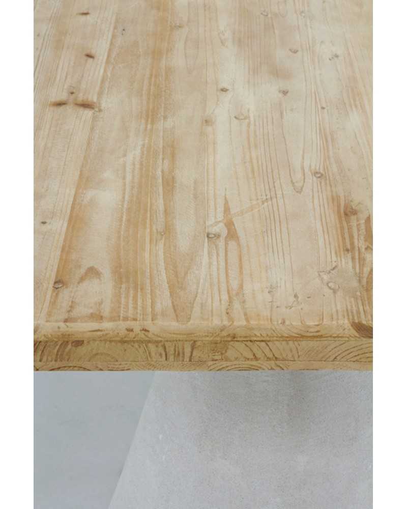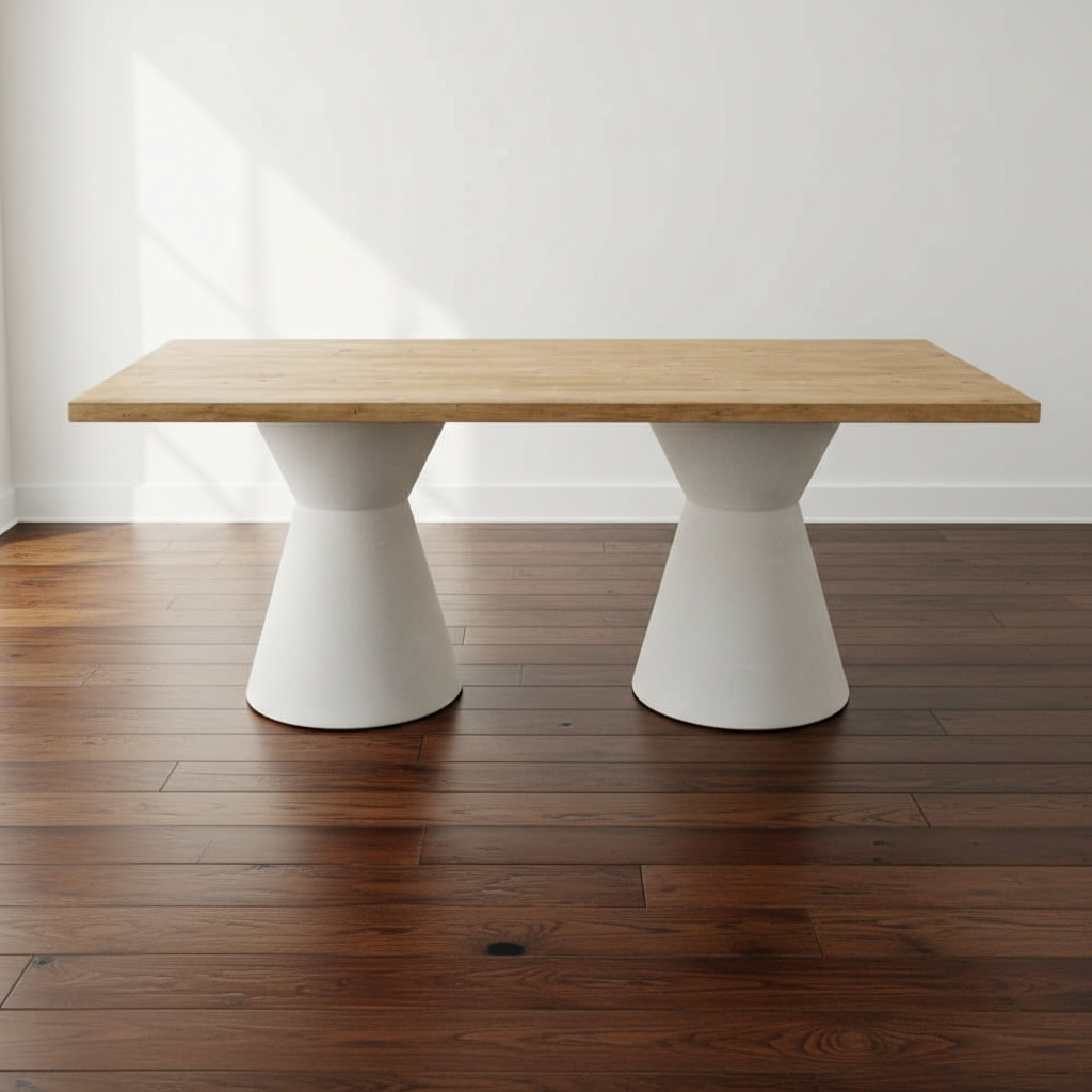 Mesa de comedor rectangular de estilo contemporáneo que combina un sobre de madera de abeto en tono natural con una base doble de poliresina acabado cemento blanco y tacto rugoso, creando un contraste elegante y muy decorativo para el comedor. Su diseño robusto y el tablero atamborado de 5 cm aportan presencia y estabilidad, siendo ideal para reuniones familiares o con amigos. Gracias a sus medidas de 200 x 100 x 76 cm, ofrece espacio cómodo para entre 6 y 8 comensales. La base en forma de conos truncados añade un toque escultórico que convierte la mesa en la pieza protagonista de la estancia.