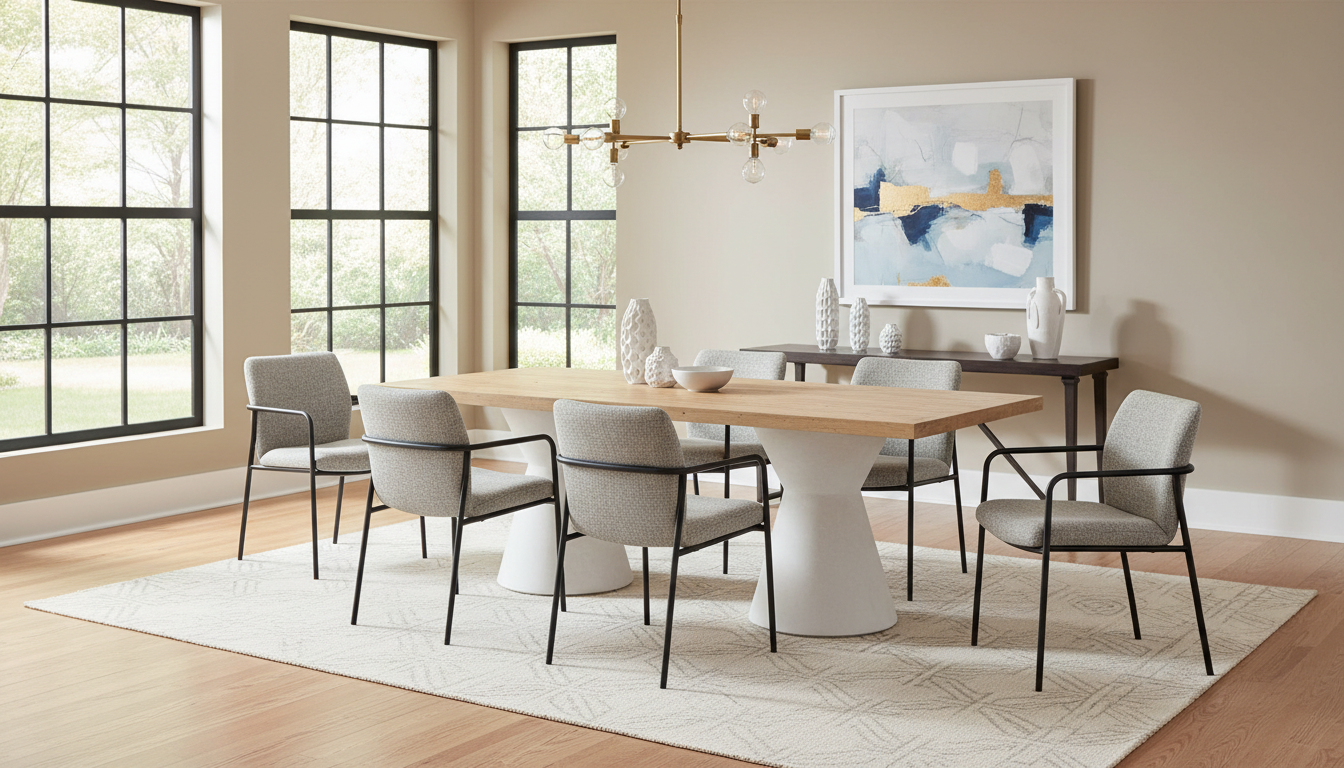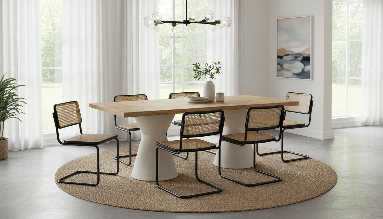 Mesa amplia y funcional, con sobre de madera cálida y base blanca efecto cemento, perfecta para un comedor moderno o rústico actual, con capacidad para varios comensales.