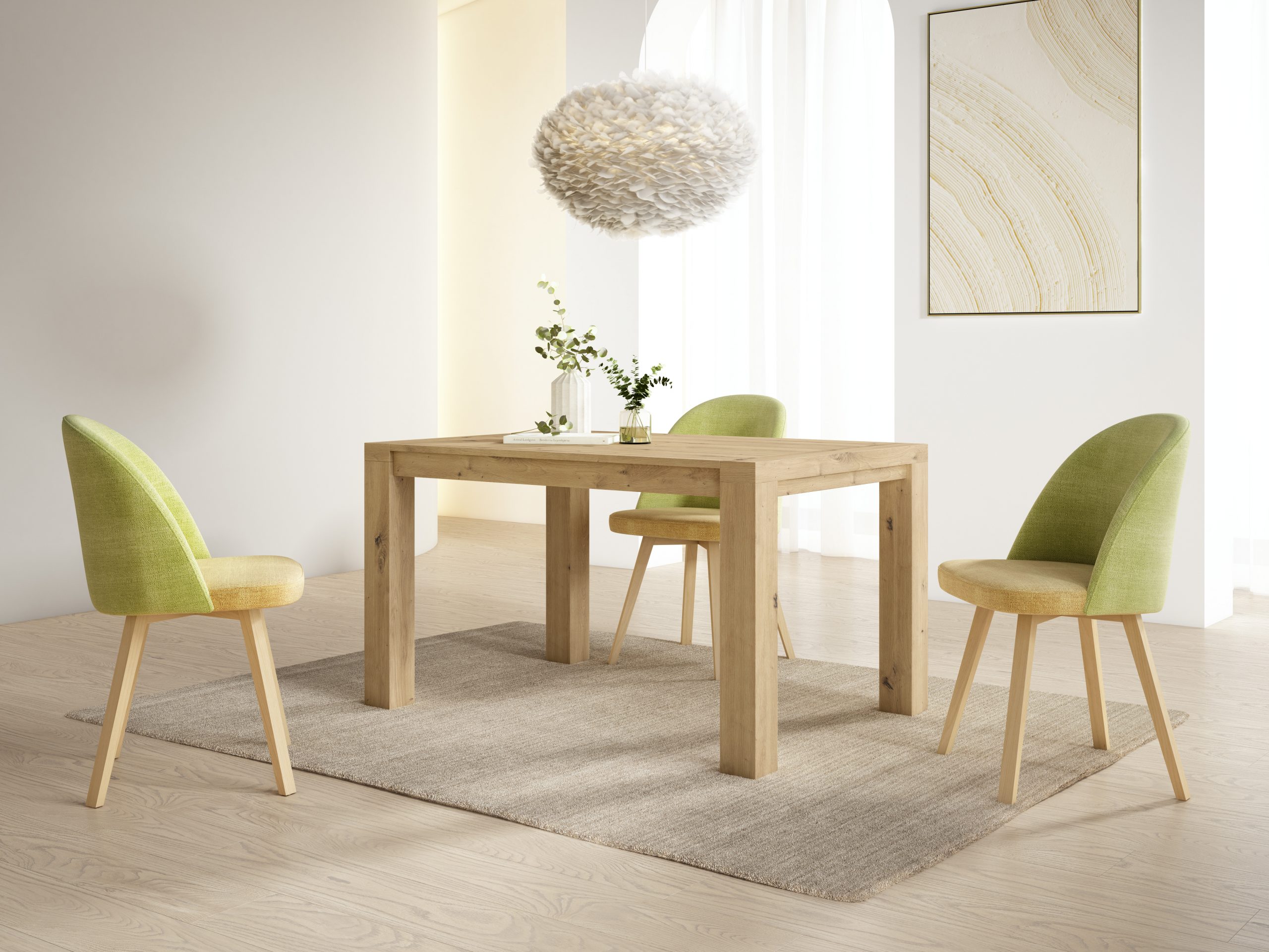 Mesa de comedor rectangular de líneas sencillas y diseño contemporáneo que encaja fácilmente en comedores modernos o ambientes más clásicos. Fabricada en madera, ofrece una superficie amplia y lisa, perfecta para las comidas diarias, reuniones familiares o sesiones de trabajo ocasionales. Sus patas robustas, colocadas en las esquinas, aportan gran estabilidad y dejan un espacio cómodo para las sillas alrededor. La textura de la madera y los pequeños nudos visibles le dan un carácter natural y acogedor, convirtiéndola en una pieza protagonista que añade calidez sin recargar el espacio.