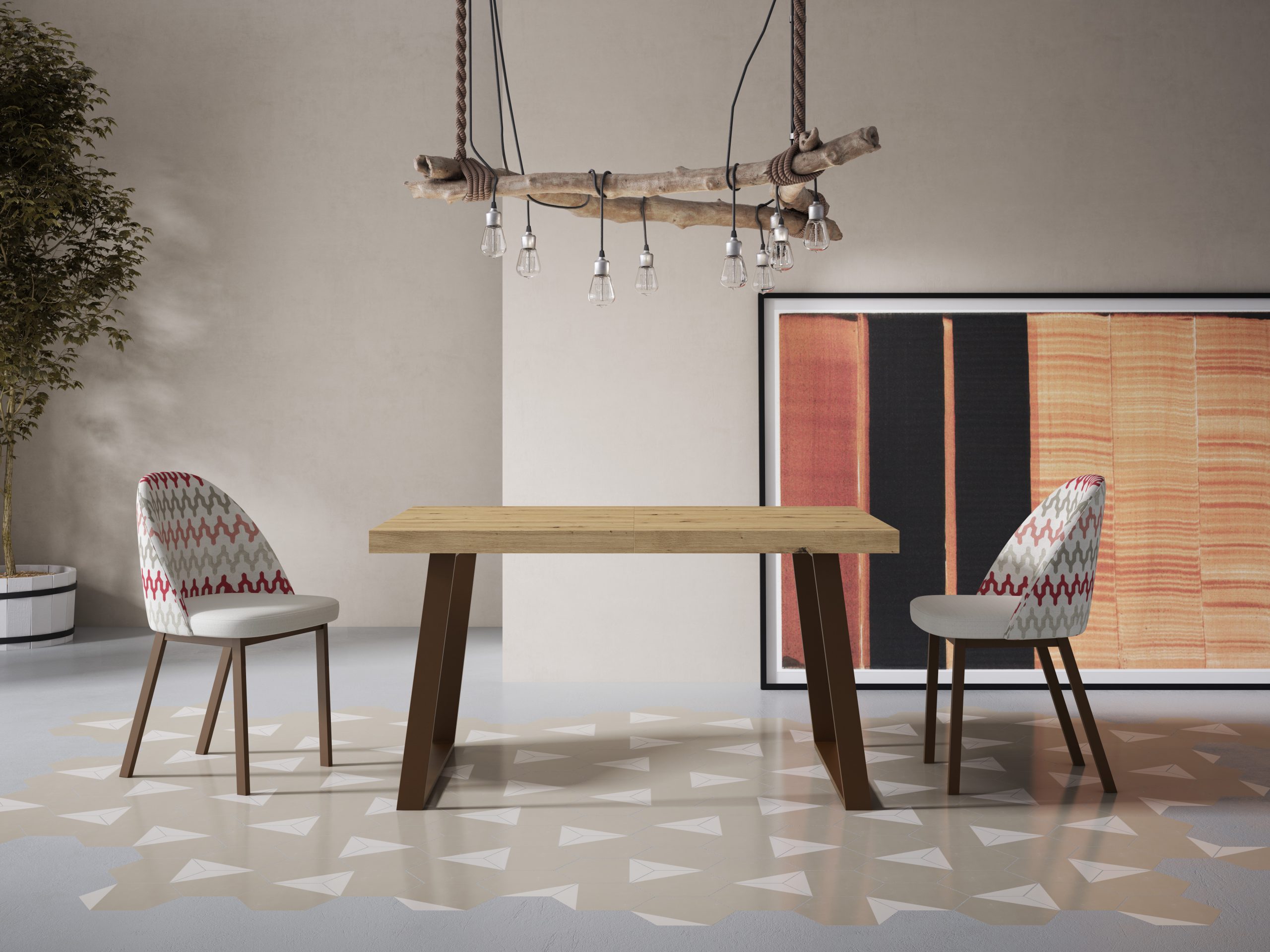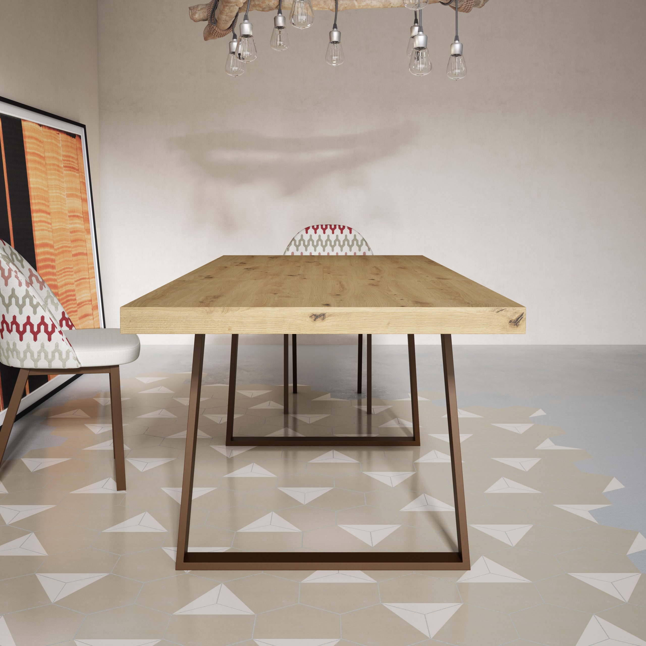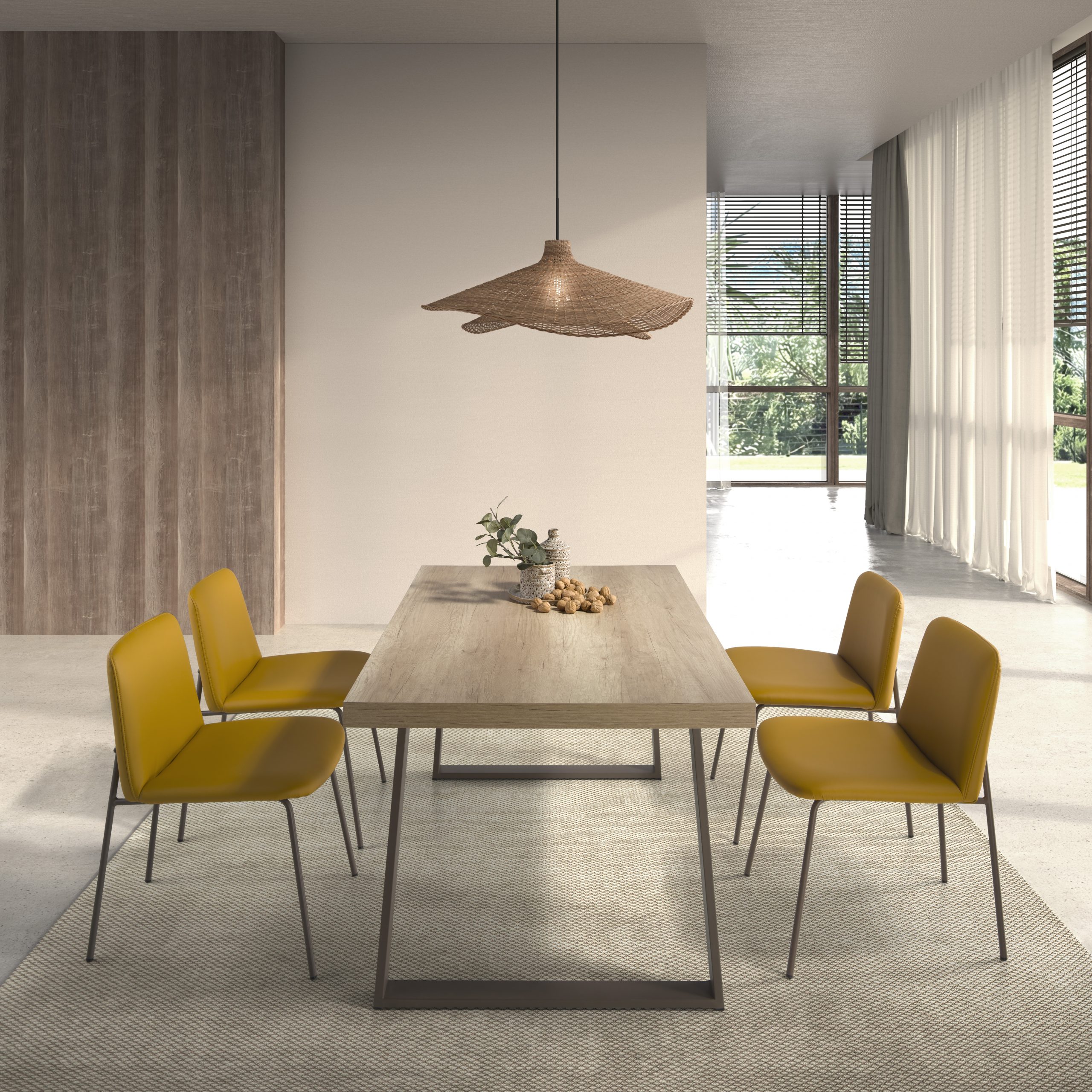 Esta mesa de comedor presenta un diseño contemporáneo y minimalista, ideal para espacios modernos y luminosos. El tablero, de líneas rectas y cantos bien definidos, transmite solidez y una sensación de superficie generosa, perfecta para reunir a varias personas con comodidad. Las patas metálicas en forma de marco inclinado aportan un aire industrial y ligero a la vez, dejando el espacio inferior despejado para las piernas y las sillas. Su silueta limpia facilita combinarla con distintos estilos de sillas y accesorios, desde los más sobrios hasta los más atrevidos. Es una pieza funcional y elegante, pensada para el día a día y las ocasiones especiales.
