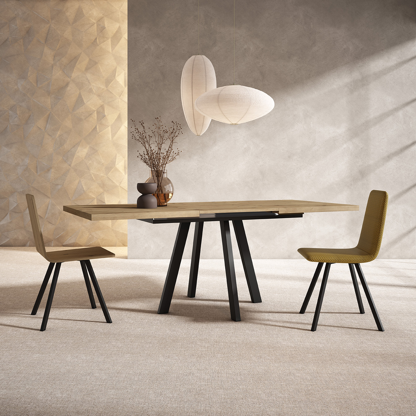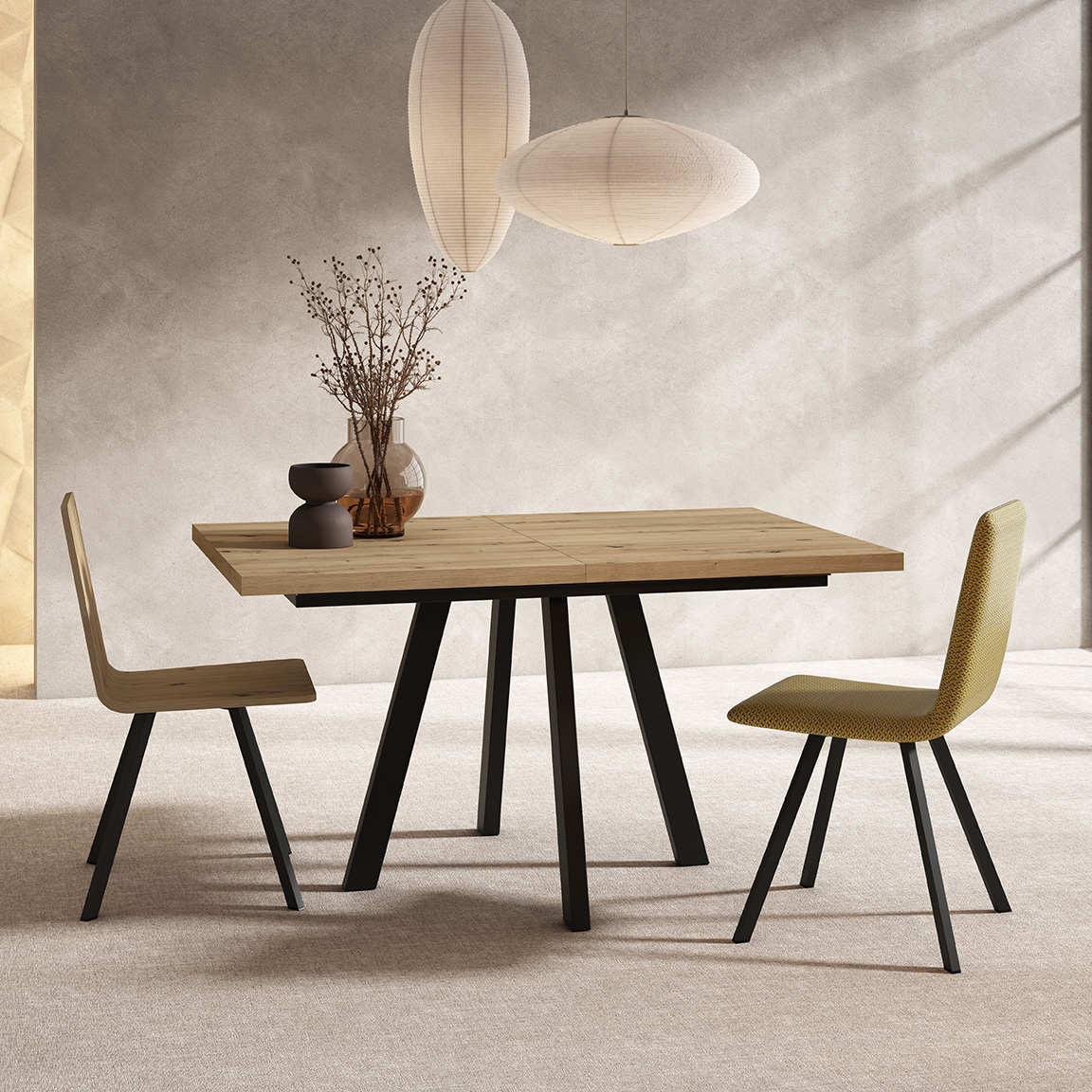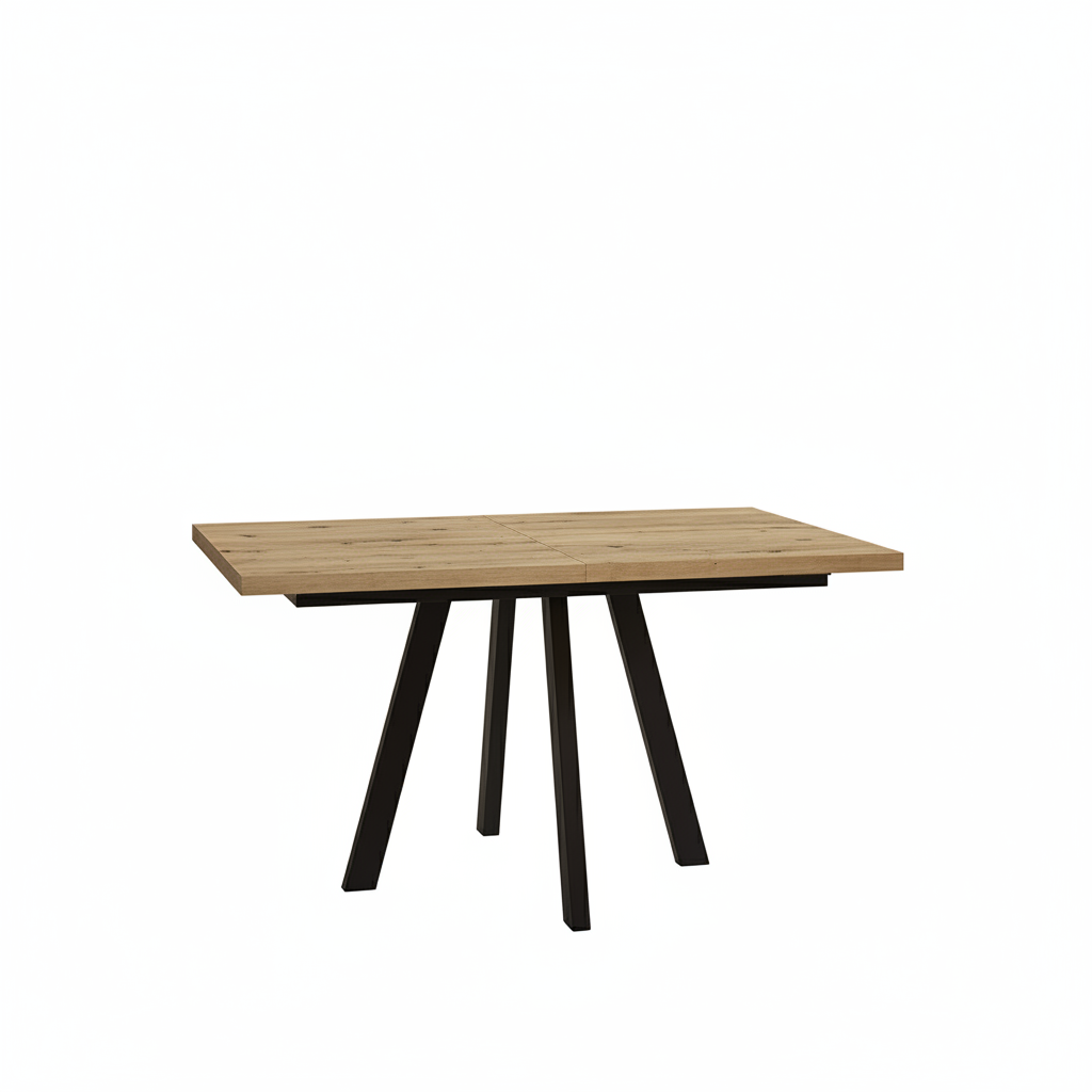 Mesa de comedor de líneas modernas, con tapa rectangular de madera y diseño extensible para adaptarse a diferentes reuniones. La estructura metálica en forma de patas abiertas aporta estabilidad y un toque industrial, perfecta para salones contemporáneos.